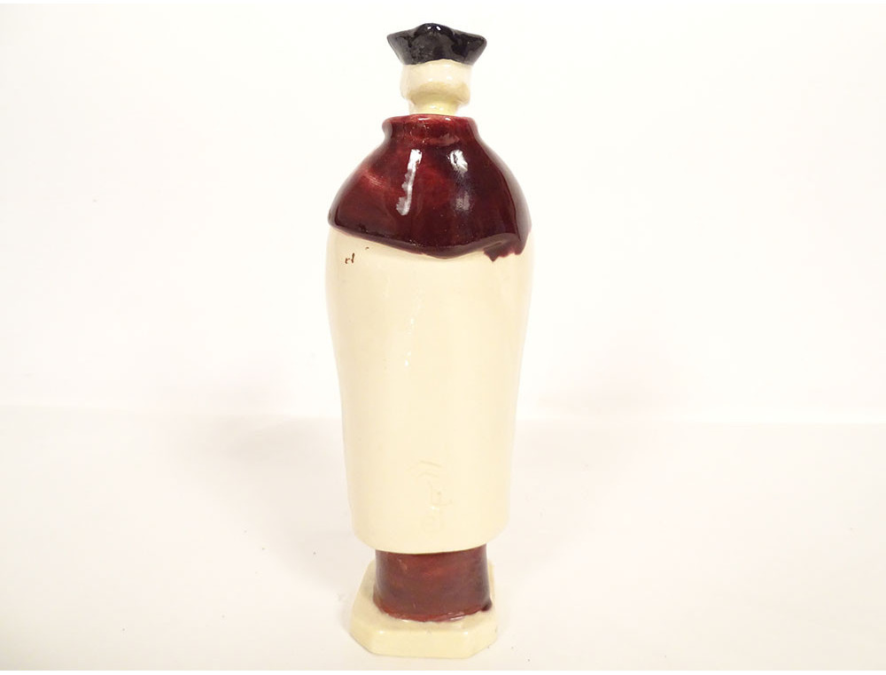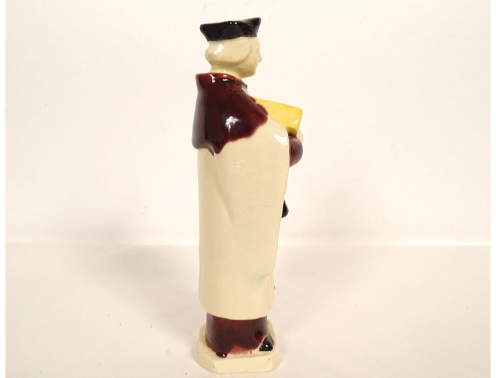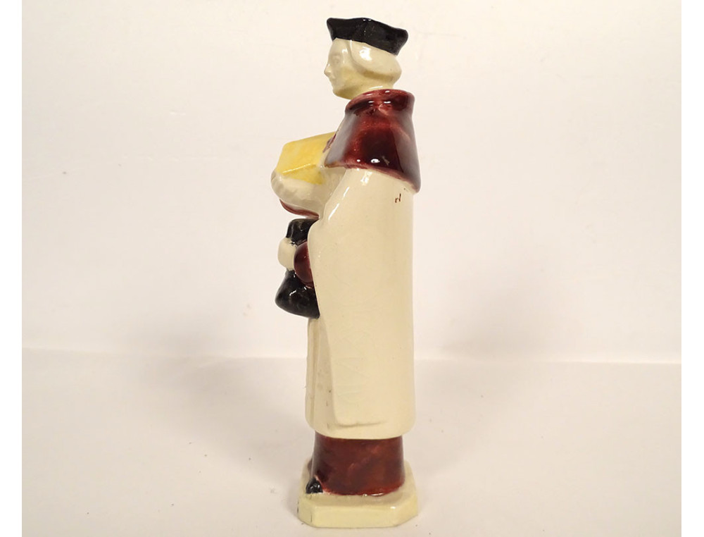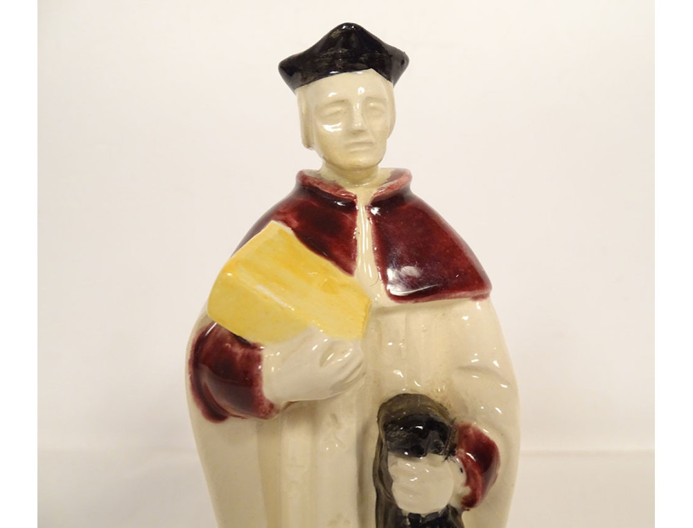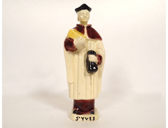 Enamelled earthenware statuette, most likely from Quimper, monogrammed JL for Jeanne Levêque* on the back, representing Saint Yves** (Breton saint) in lawyer's attire, with fleurs-de-lis in relief on his robe, from the 20th century.