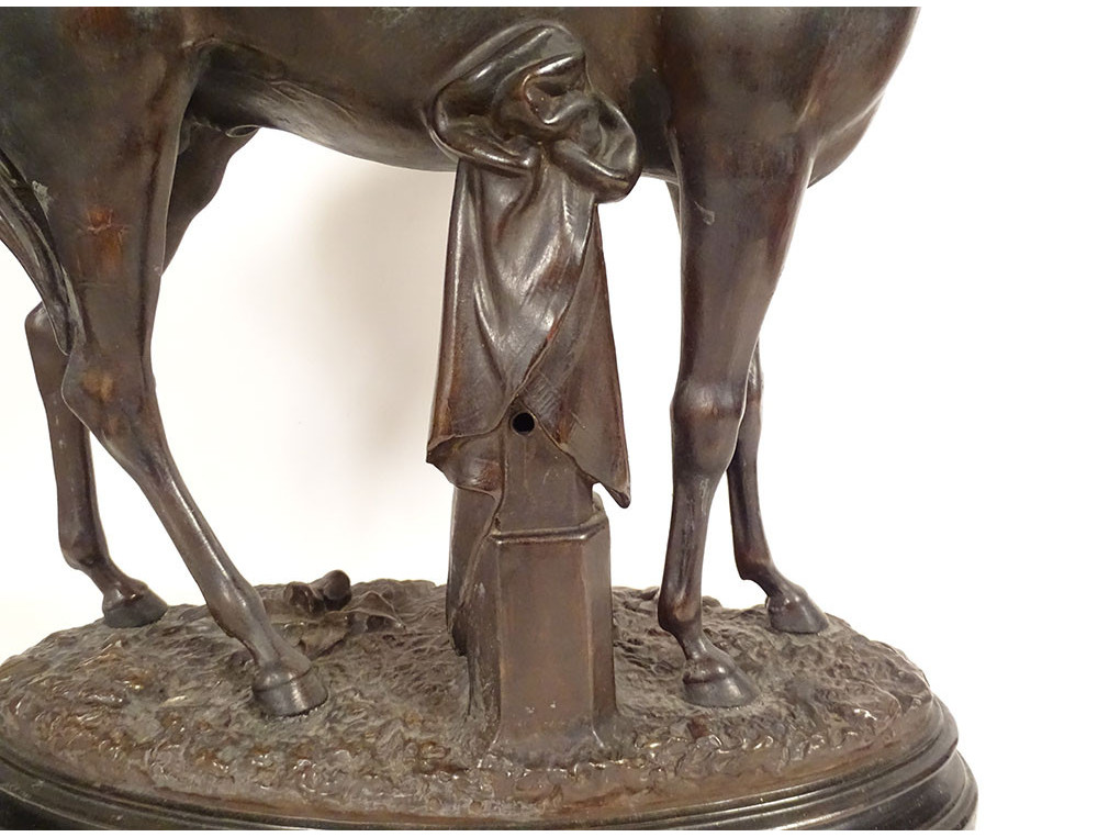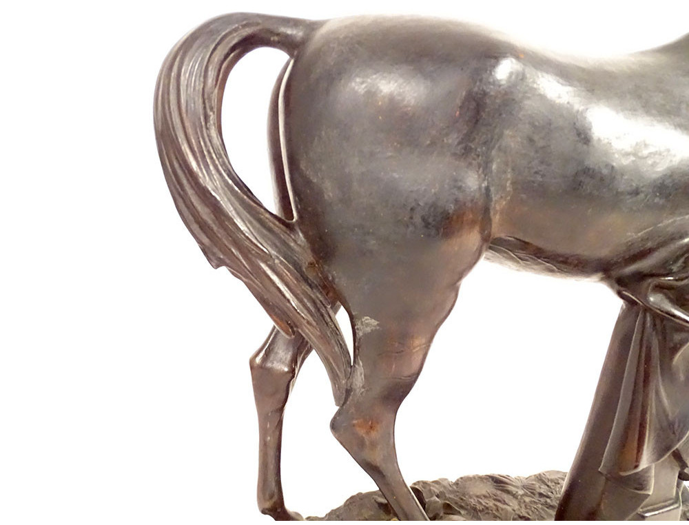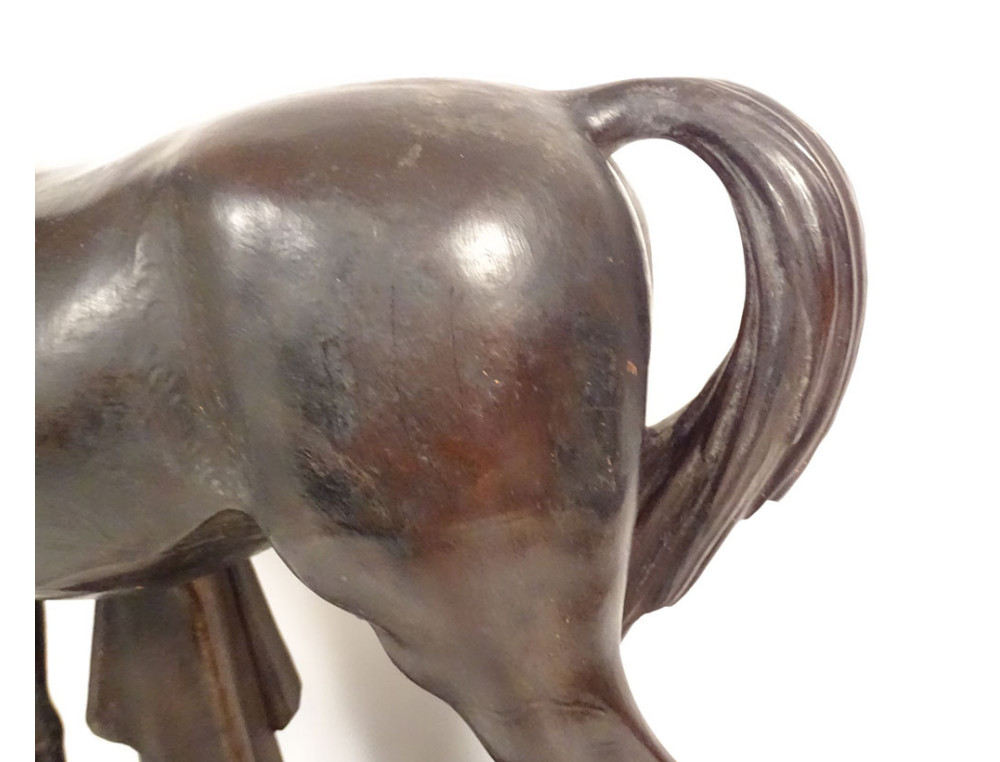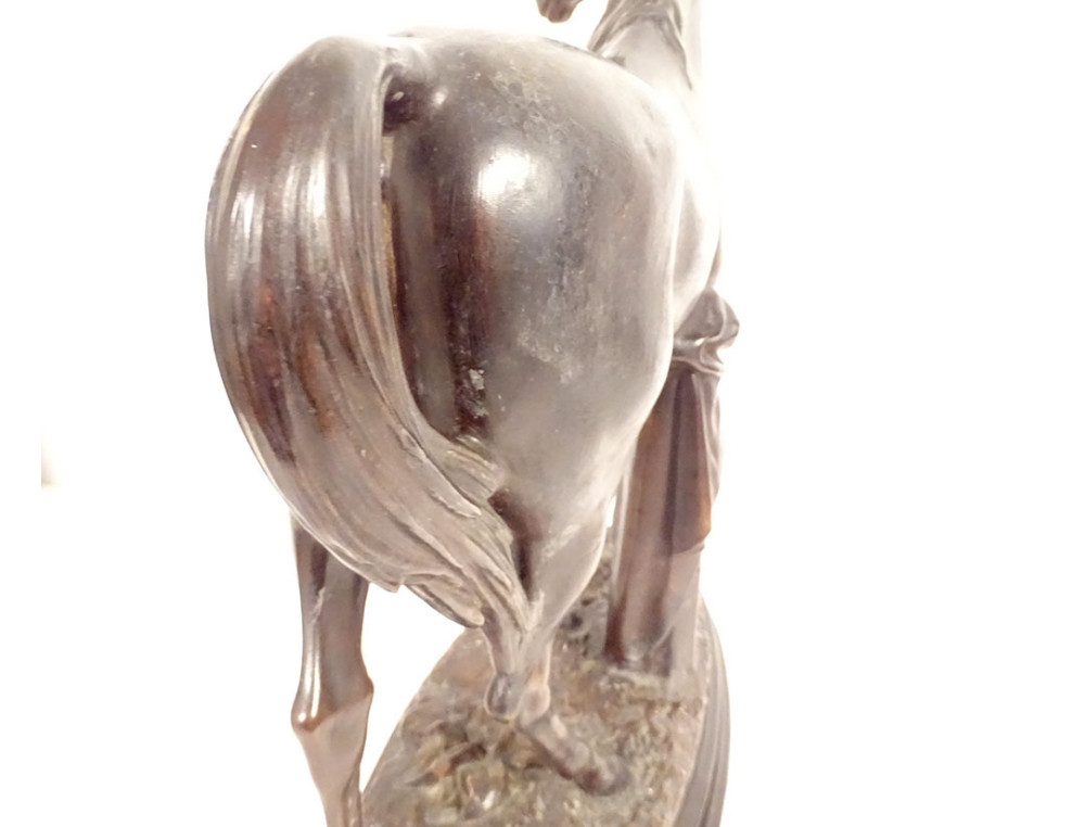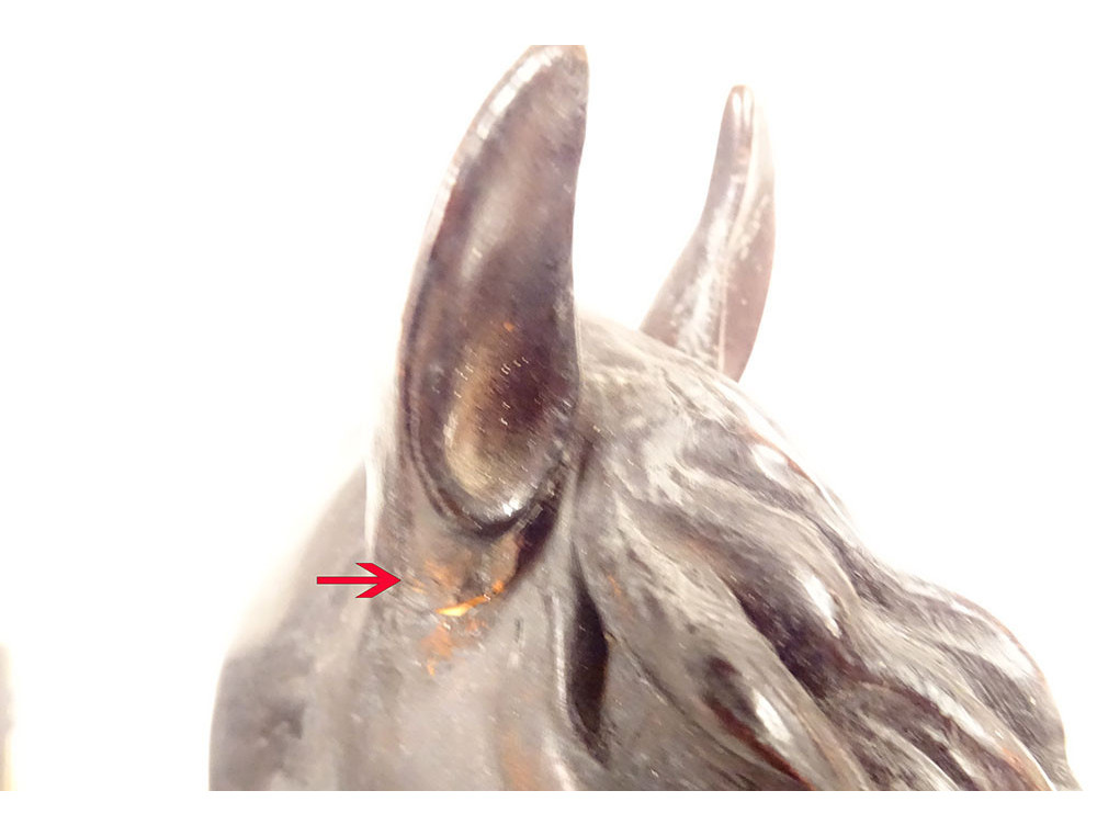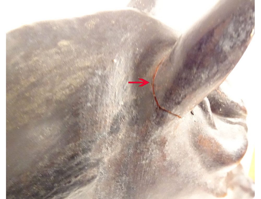 Note: one ear has been glued back on (see last photos), some scratches and wear on the patina, wear from age, see photos.