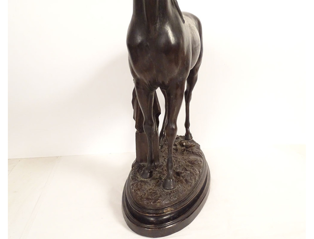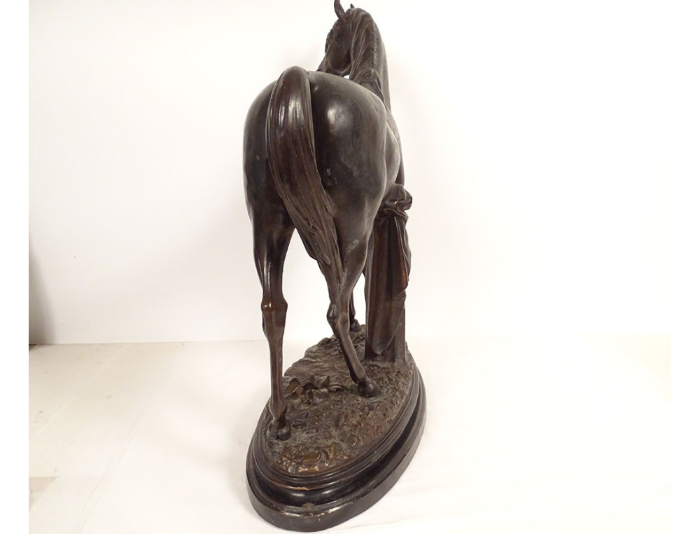 Large terracotta sculpture (brown patina) representing a beautiful racehorse, a thoroughbred or stallion, standing still, with its head raised and ears erect, from the 19th century.