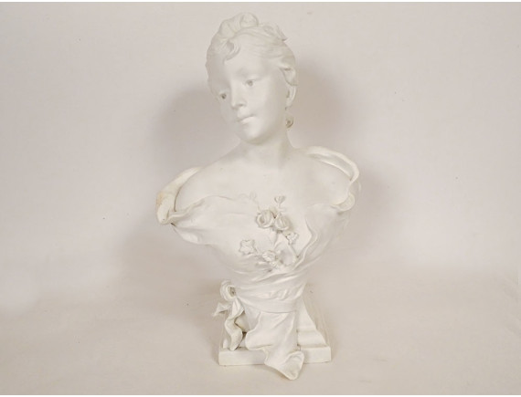 Biscuit porcelain bust (from Limoges) signed S. Kinsburger* representing an elegant young woman with a bouquet of flowers in the neckline of her dress, from the Art Nouveau period, late 19th-early 20th centuries.