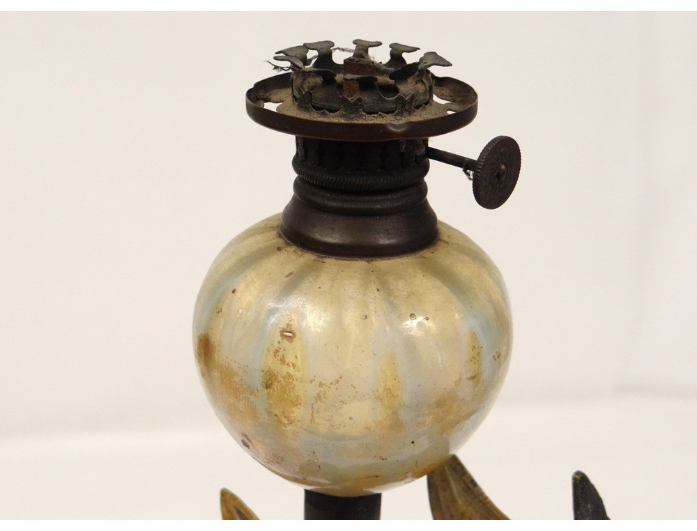 Very nice small oil lamp lead Nuremberg full color, representing the Fable of the Fountain of the Raven and the Fox, period late nineteenth century.