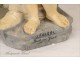 Polychrome plaster sculpture representing St. Vincent de Paul with two young children at his feet, marked