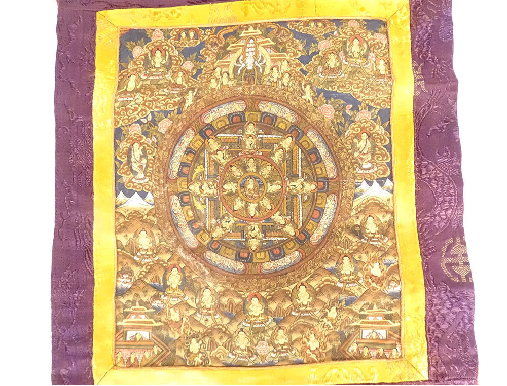 Buddhist painting known as Tibetan Thangka* representing a Mandala of multiple characters and divinities, origin Tibet - Nepal, from the late 19th - early 20th centuries.