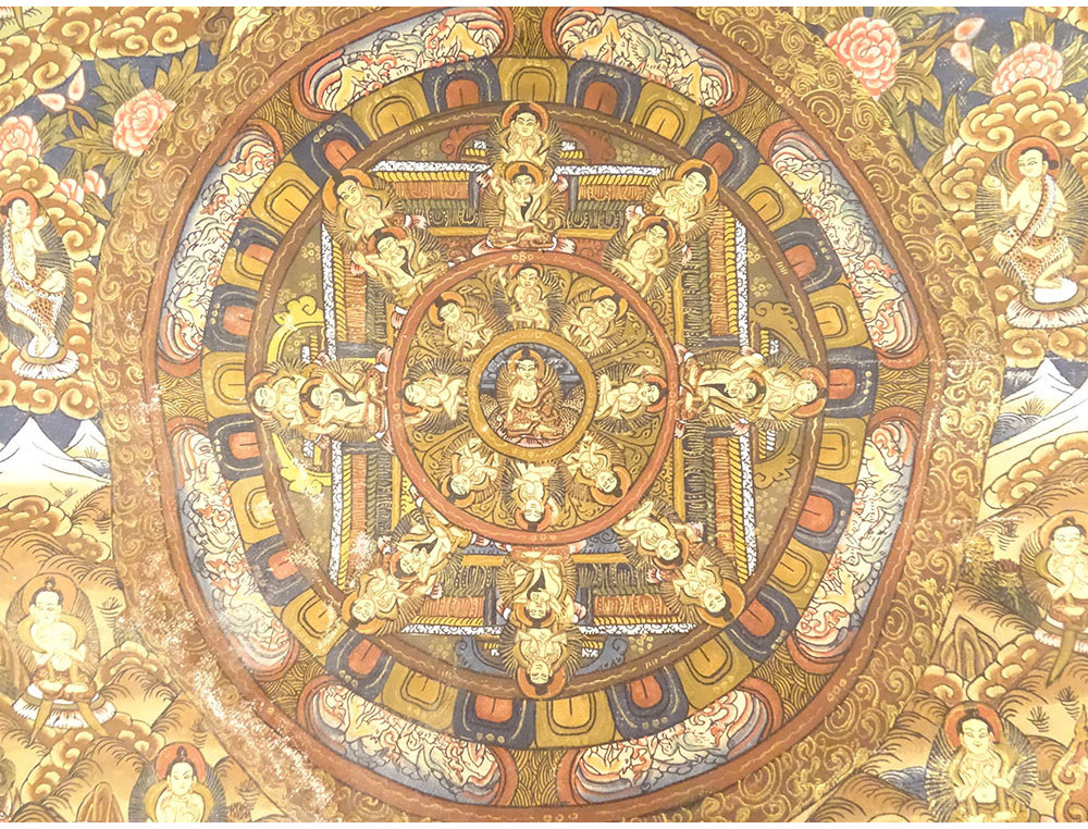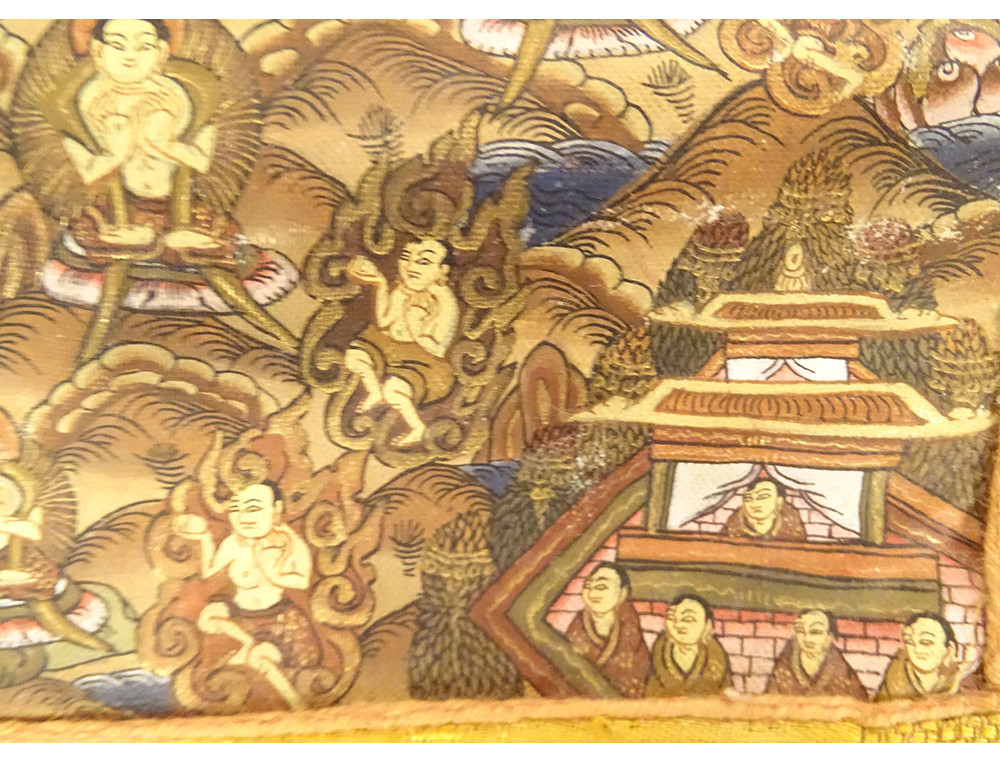Thangkas are most often intended to serve as a support for meditation. The subject is depicted in the center, surrounded by subordinate figures who are part of his retinue, his various divine forms, etc. The important deities of the pantheon are represented in the upper part. The lower part is reserved for various offerings and the guardian deities of the Law. Mountains, an element of traditional Tibetan iconography, are also depicted.