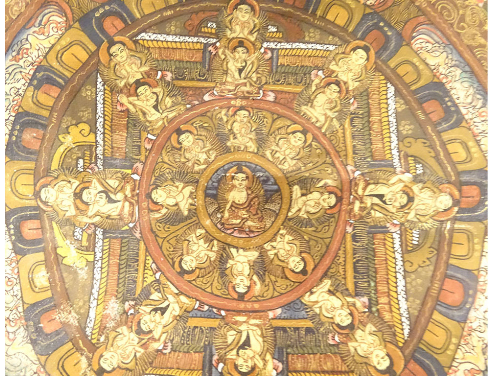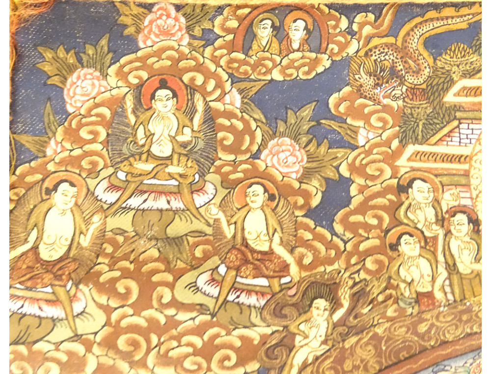 also spelled "tangka", "thanka" or "tanka", literally "thing that is unrolled", "roll"1, is a painting, a drawing, or a fabric on canvas originating from India and characteristic of Tibetan Buddhist culture. They are found in all sizes, from portable thangkas that can be rolled and unrolled using two sticks passed through hems, to monumental thangkas intended to be unrolled on a hillside area or on a thangka wall and which can reach several dozen meters in height. The subjects of thangkas are related to Buddhism. They can represent: