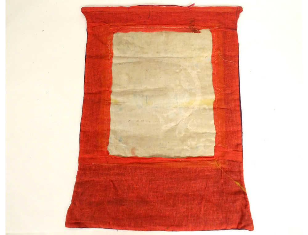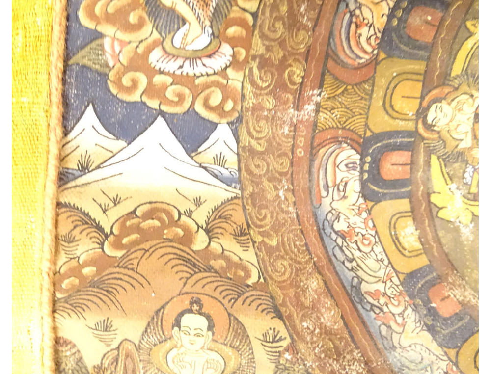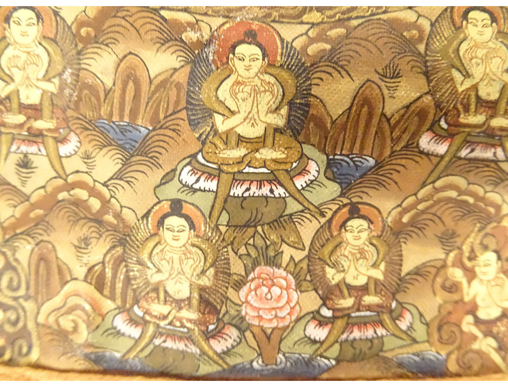 This thangka is in good overall condition. It is framed in fabric (moiré)