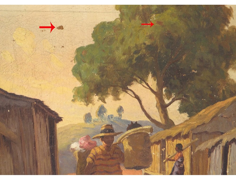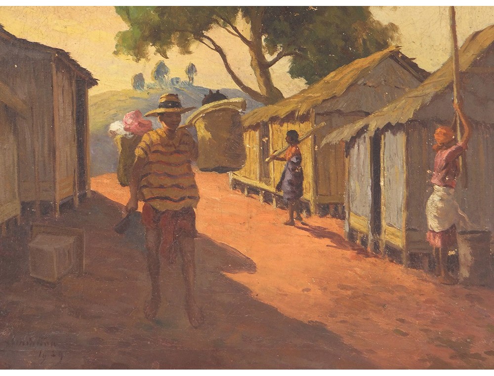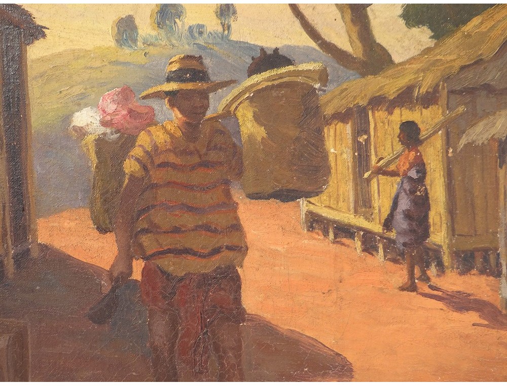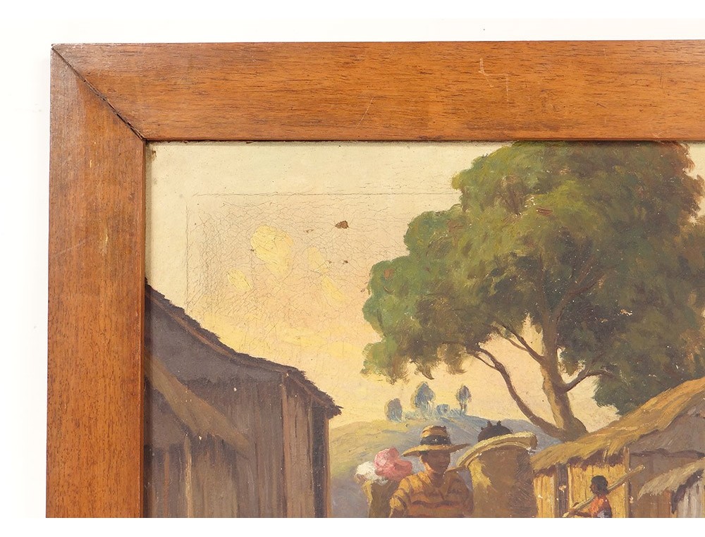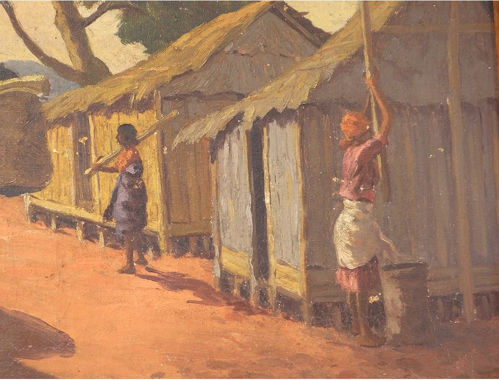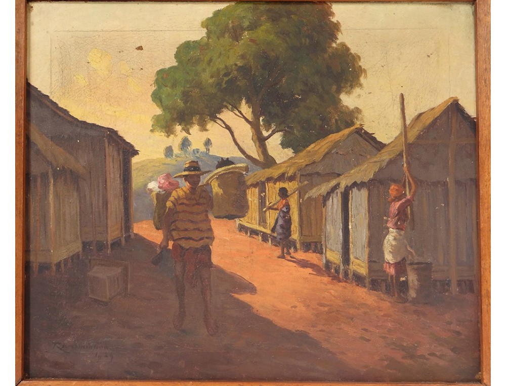 Oil on canvas depicting a view of a street full of characters in a village in Madagascar (notament a woman pounding rice and a man carrying baskets on his shoulder), signed J. Rambinintsoa * and dated 1939, vintage twentieth century .