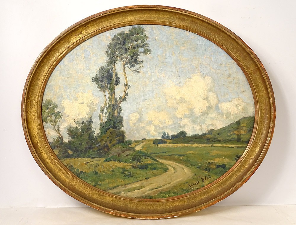 Oil on canvas in oval shape signed Robert Blot * representing a countryside landscape most certainly in Normandy, with trees along a small path, in a gilded wood frame, from the early twentieth century.