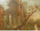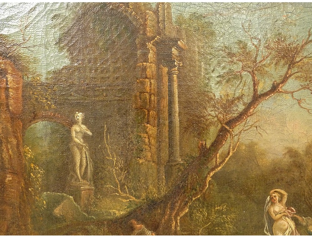 Oil on canvas depicting a landscape with temple ruins and an ancient statue on the left side, in the foreground naked women or naiads in the toilet in a river, in the background a bridge, painted in the style of Jean-Baptiste Pillement, in a gilded wooden frame decorated with a shell, from the 18th century.