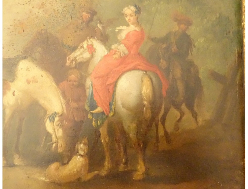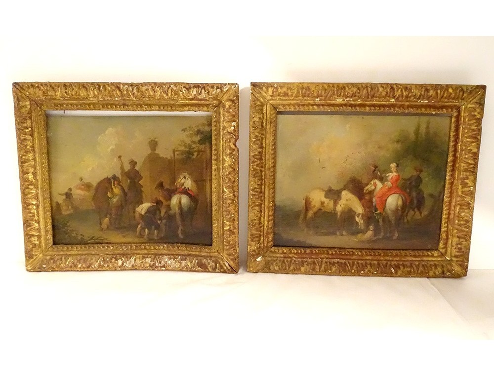 Pair of oils on panels representing two scenes of riders, gentlemen and pretty ladies, stopping during their journey, accompanied by dogs, in countryside landscapes, in gilded frames, French School, 18th century,