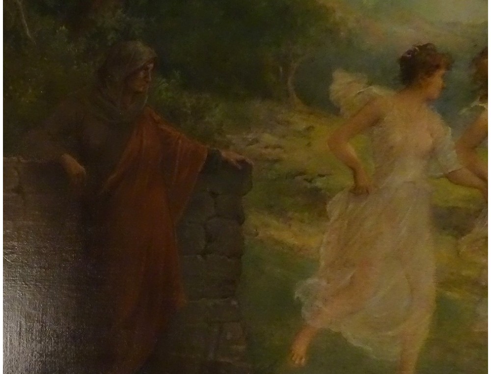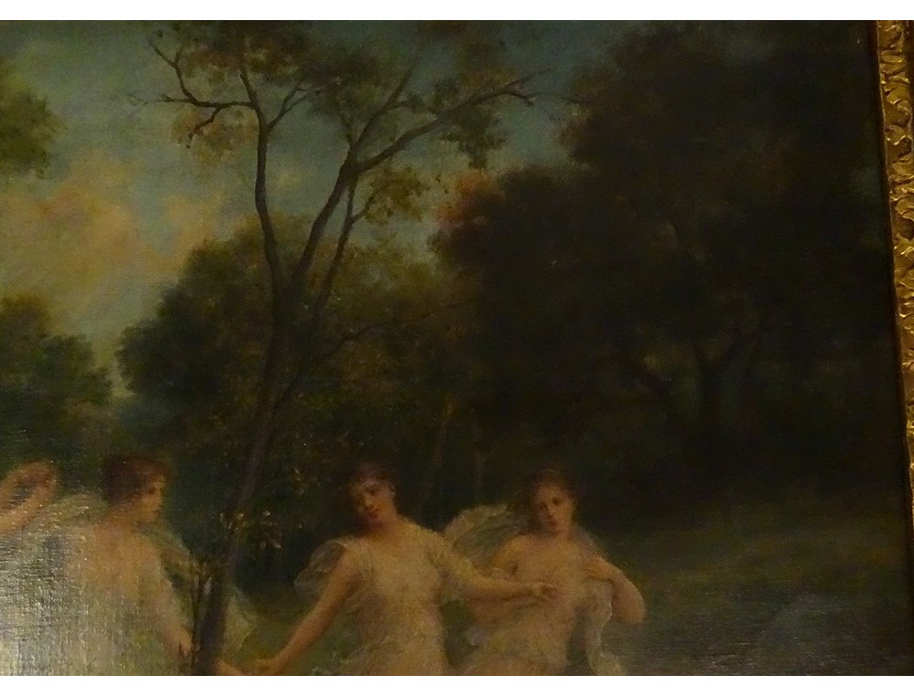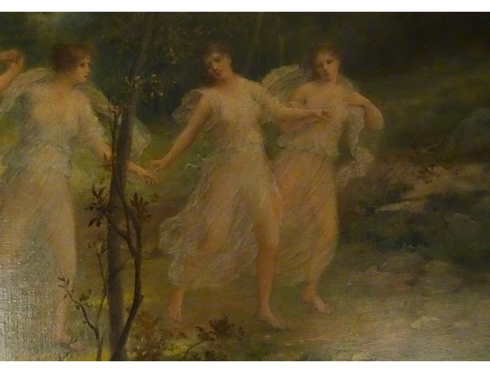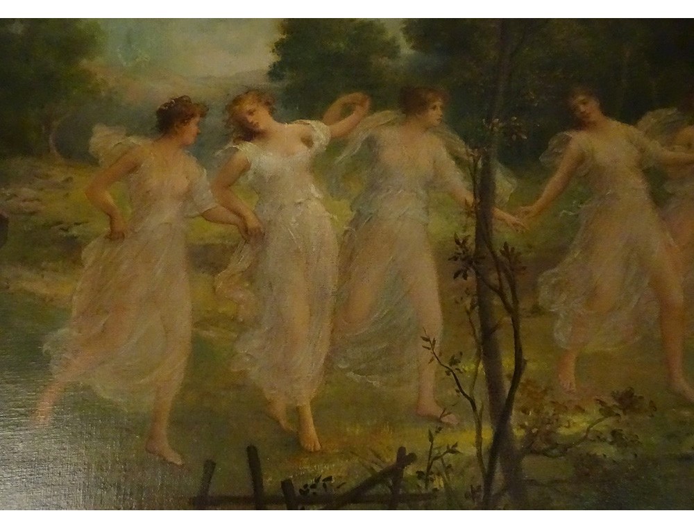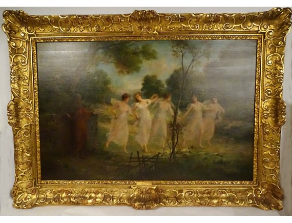 Large oil painting on canvas representing five beautiful young women, nymphs or Muses, dancing in a rural landscape, an old woman looking at them from the side, most certainly an Allegory of Spring, signed François Lafon*, in a gilded stuccoed wooden frame. shell decoration, vintage late 19th-early 20th centuries.