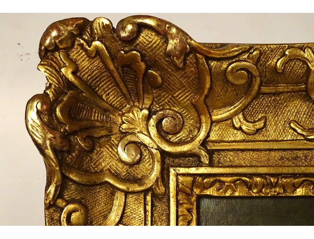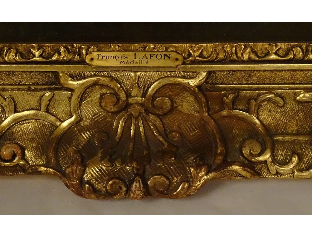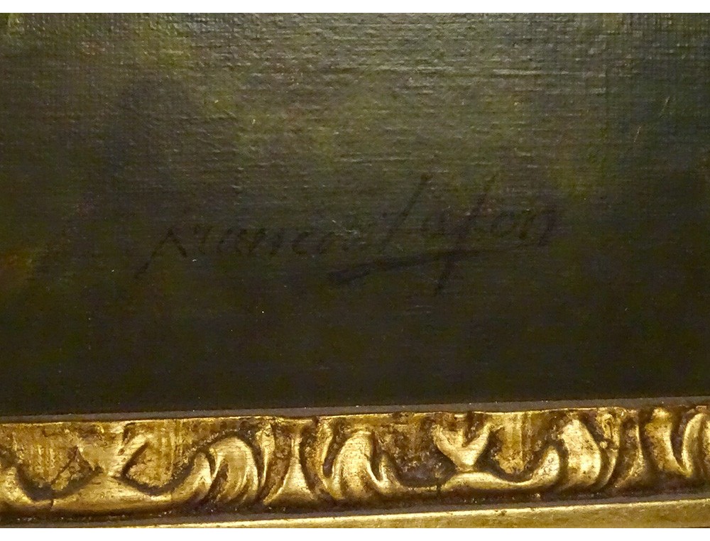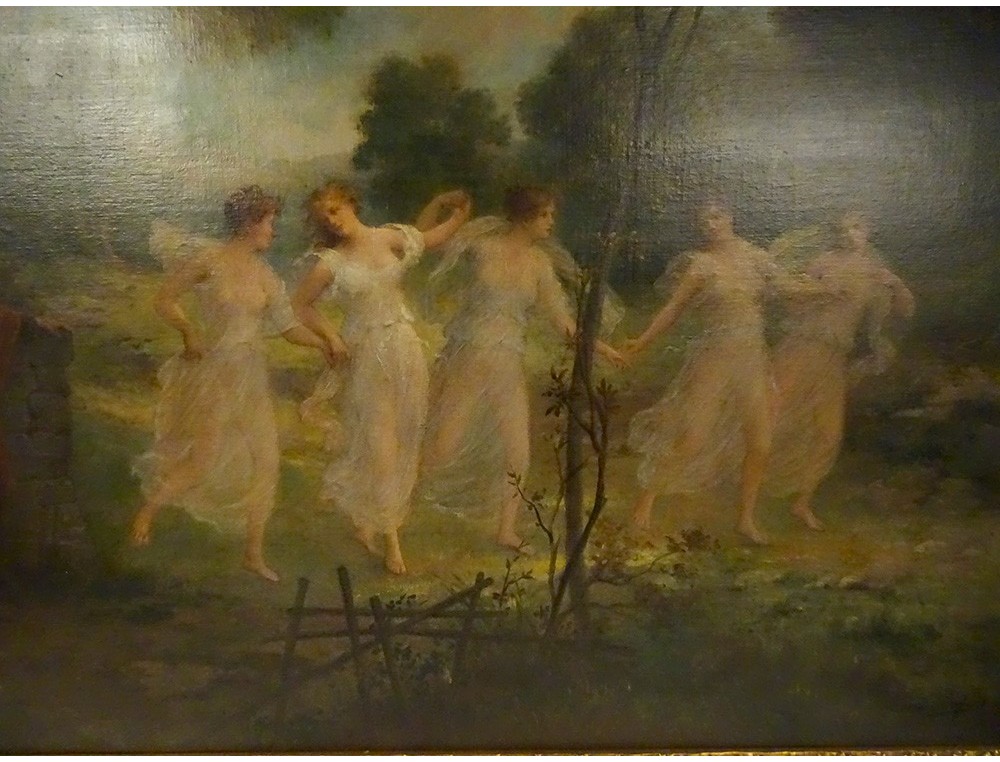 Large oil painting on canvas representing five beautiful young women, nymphs or Muses, dancing in a rural landscape, an old woman looking at them from the side, most certainly an Allegory of Spring, signed François Lafon*, in a gilded stuccoed wooden frame. shell decoration, vintage late 19th-early 20th centuries.