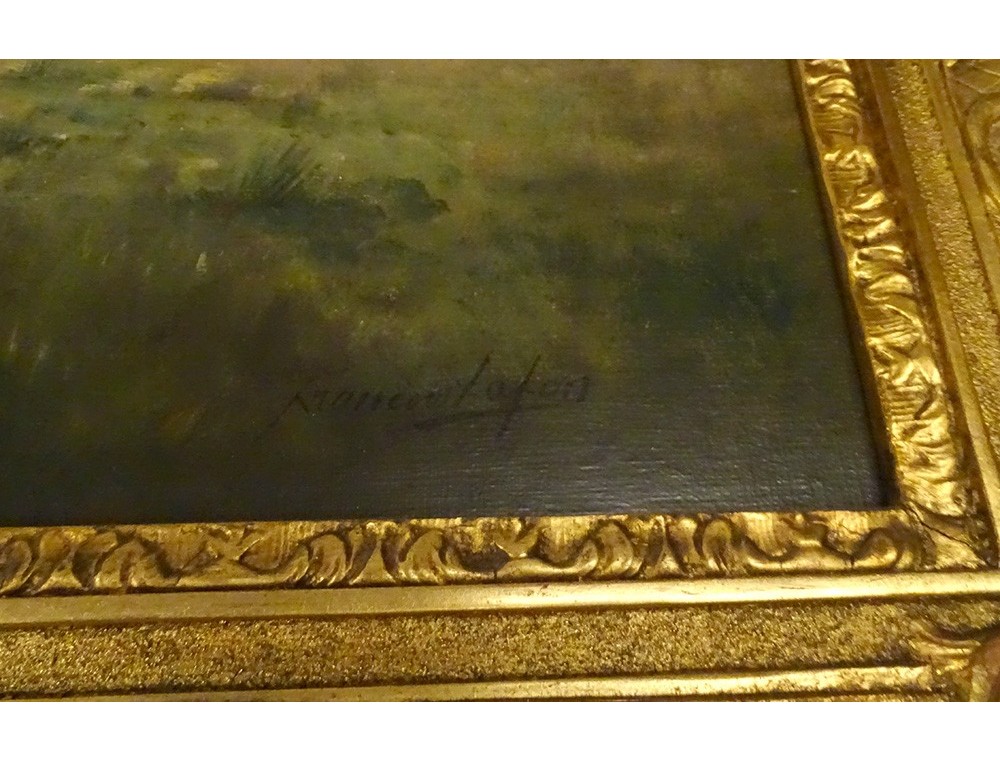 This painting is in very good condition and is very decorative due to its large size. Signed on the canvas plaque on the frame.