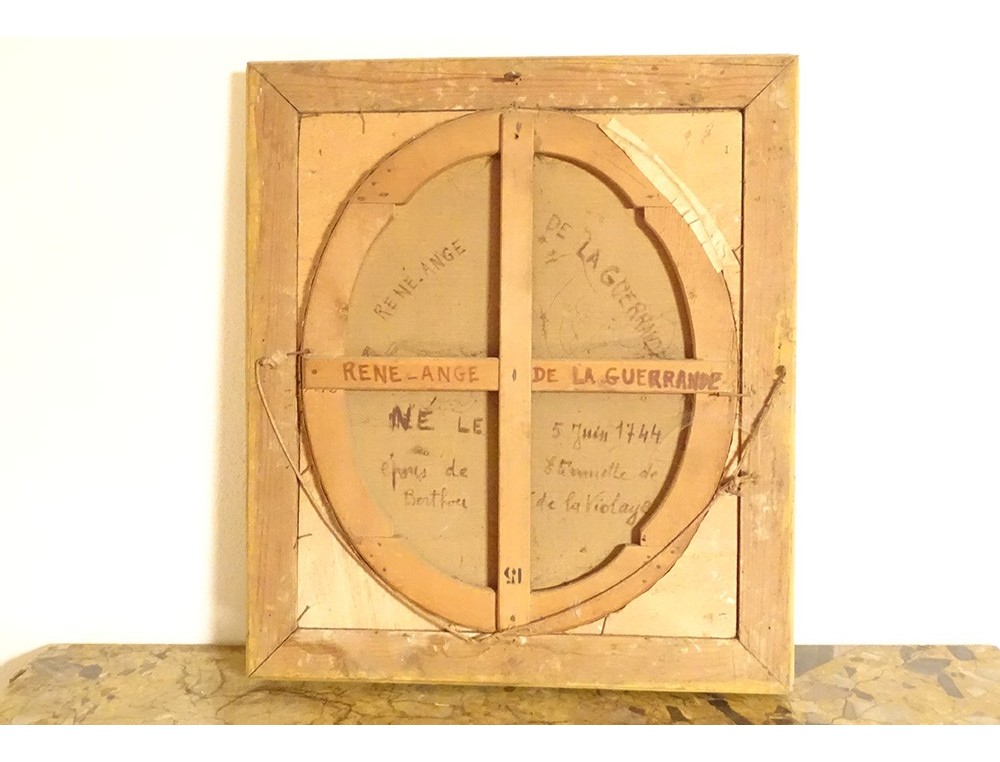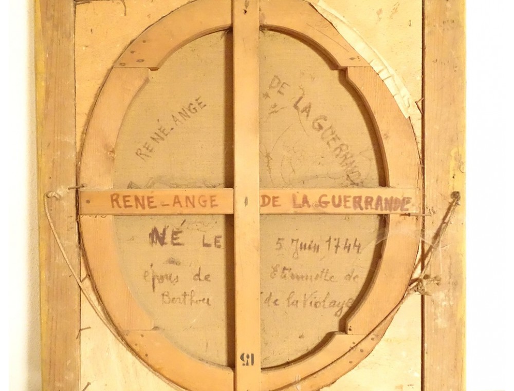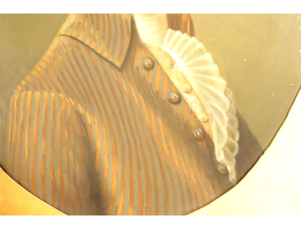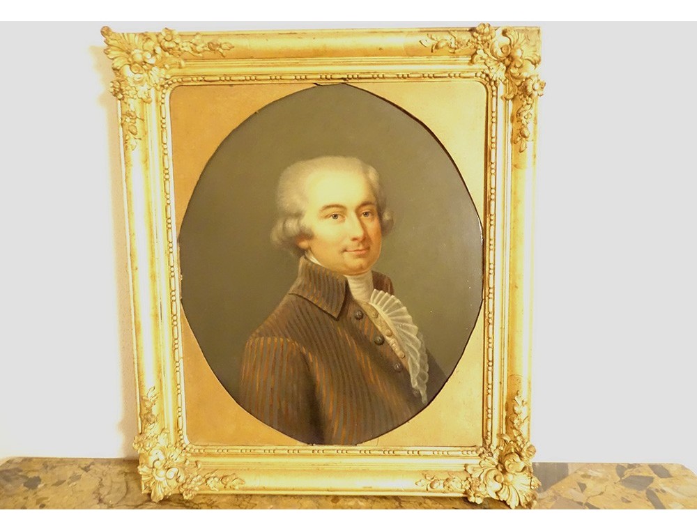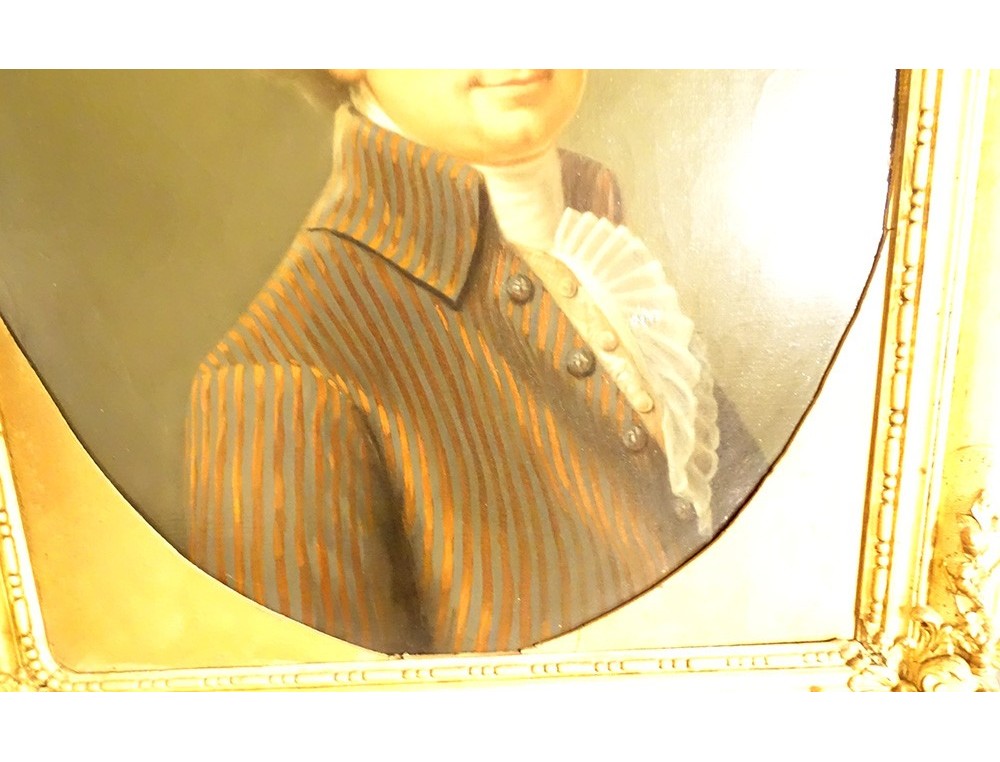Oil on oval canvas depicting René Ange de la Guerrande* (1744-1816) in a frock coat, Lord of Ville-Colleu in Matignon (North Brittany), husband of Etiennette de Berthou (daughter of the president of the nobility in the states of Brittany), in a gilded wooden frame decorated with stylized shells and foliage in the corners, from the late 18th century.