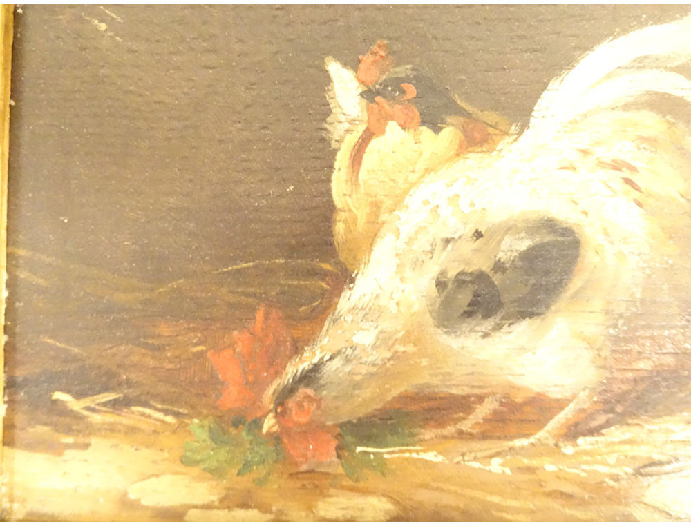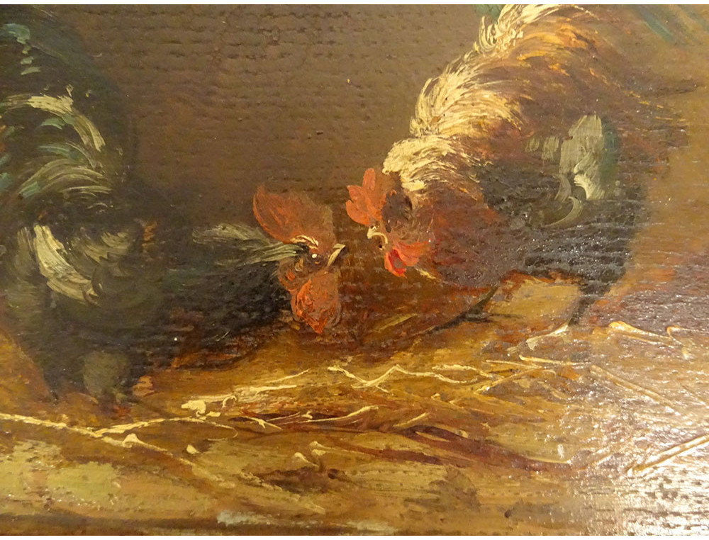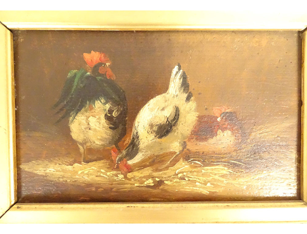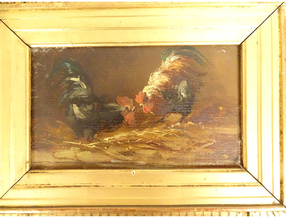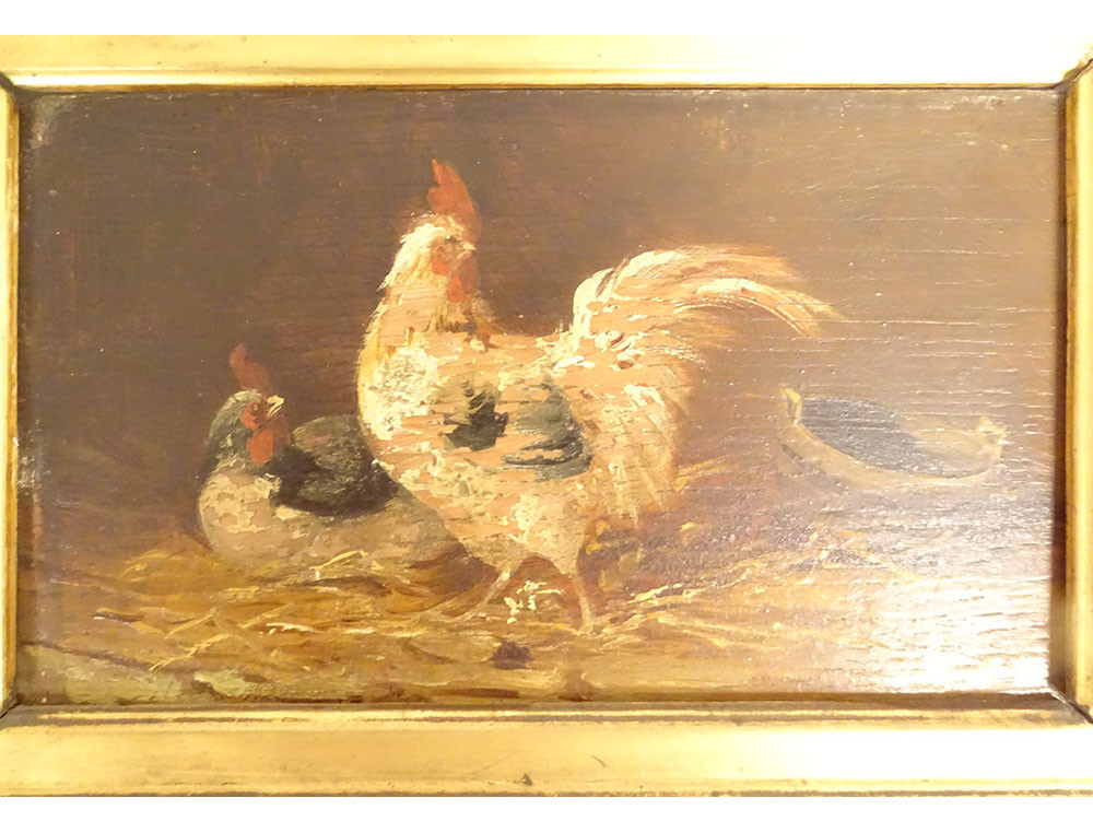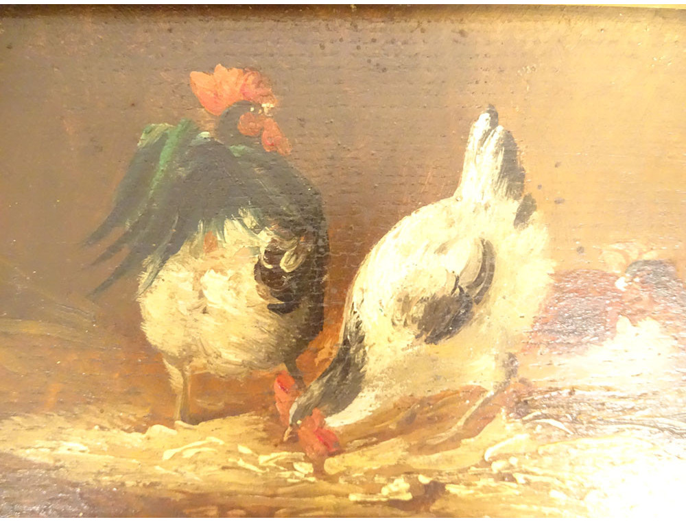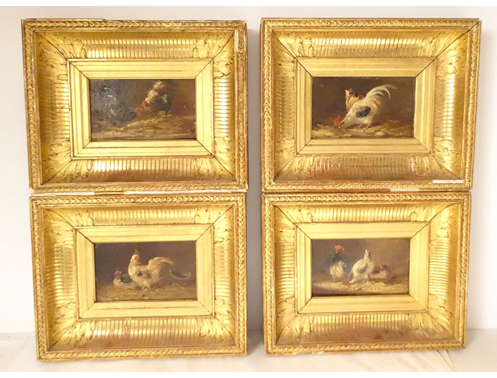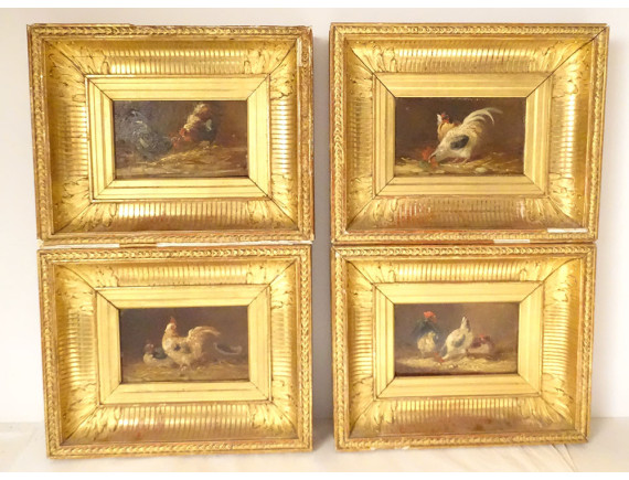 Set of 4 oils on panel depicting hens in a farmyard or henhouse as well as a cockfight, in gilded stuccoed wooden frames, from the 19th century.