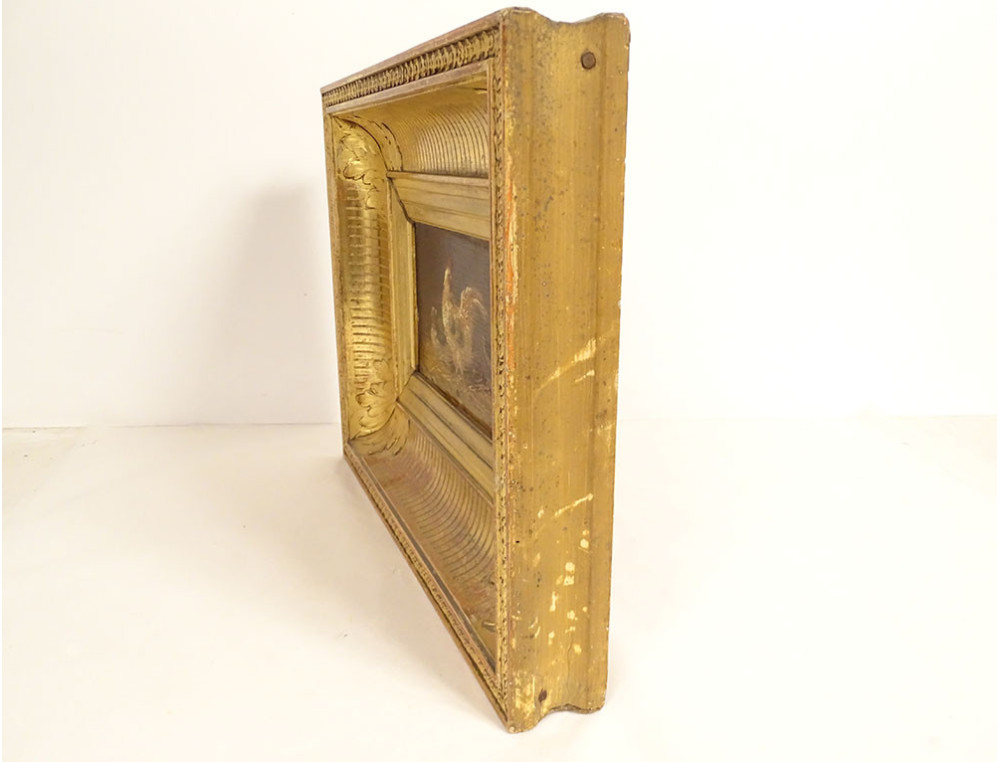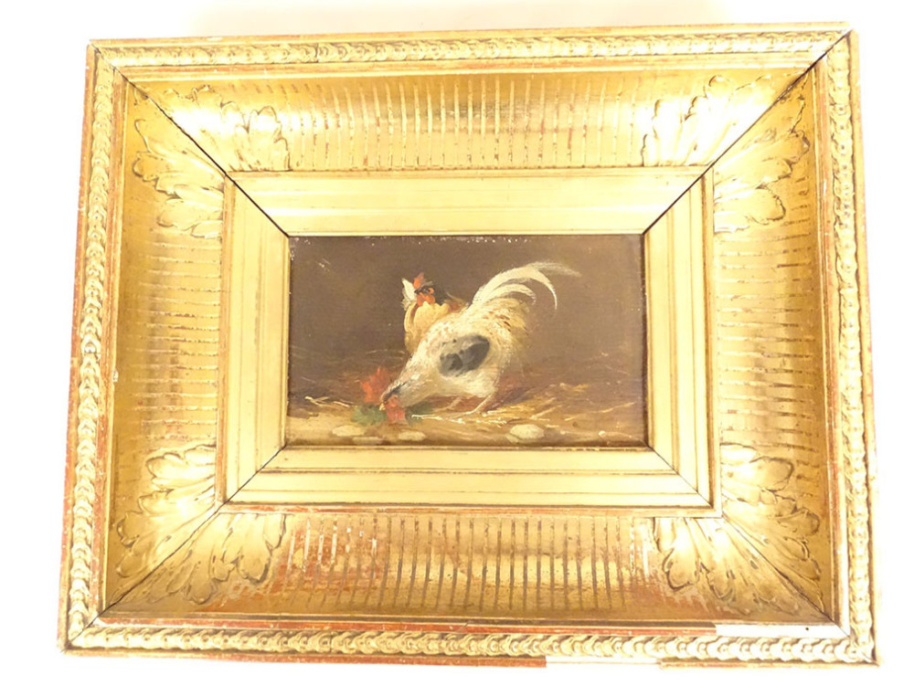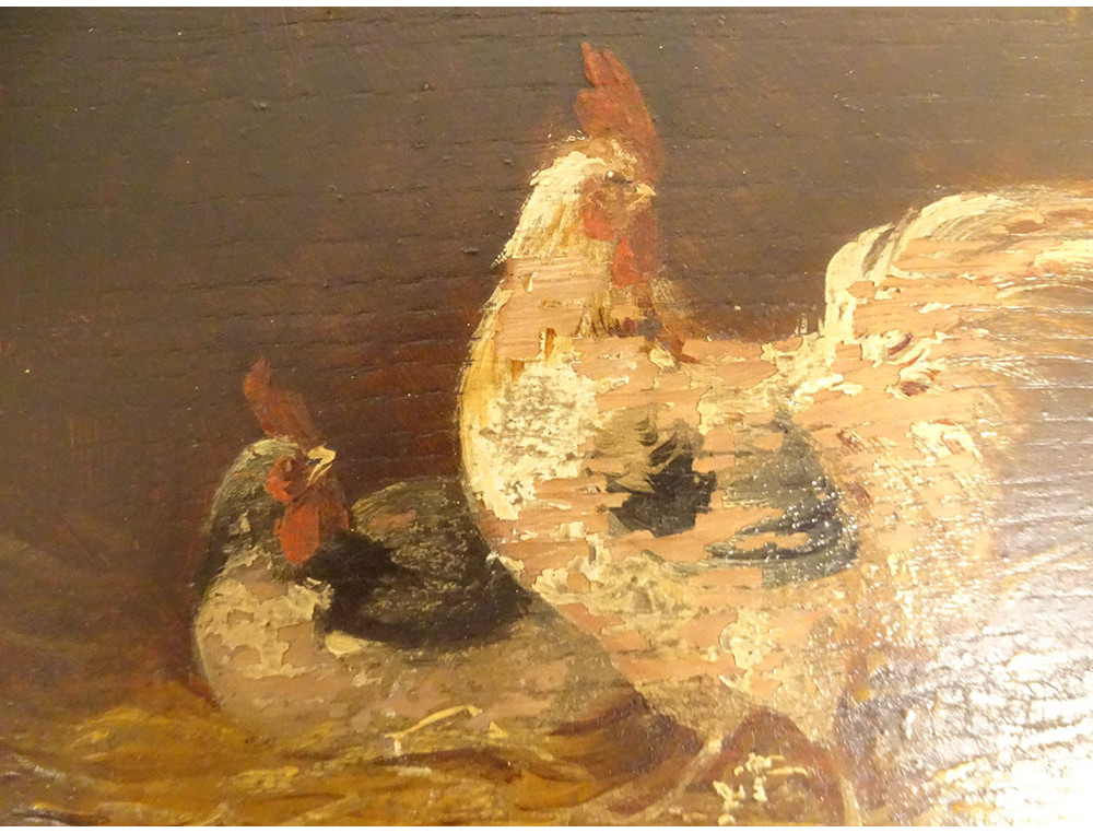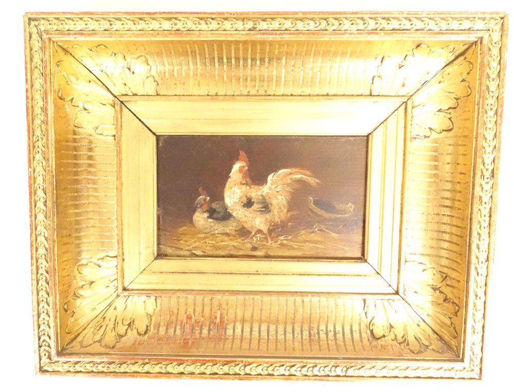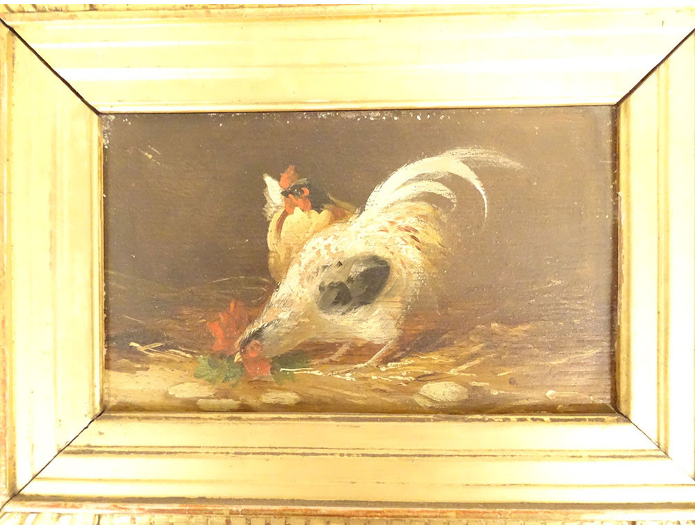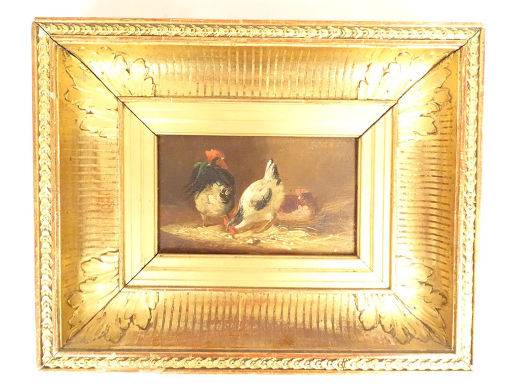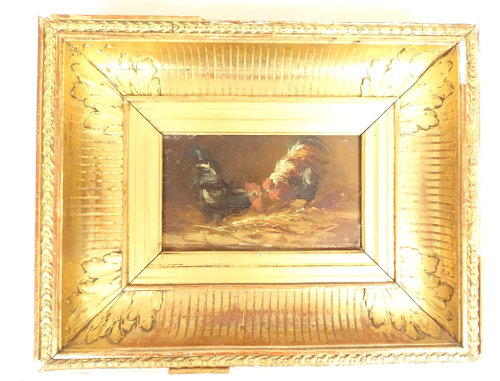 Set of 4 oils on panel depicting hens in a farmyard or henhouse as well as a cockfight, in gilded stuccoed wooden frames, from the 19th century.