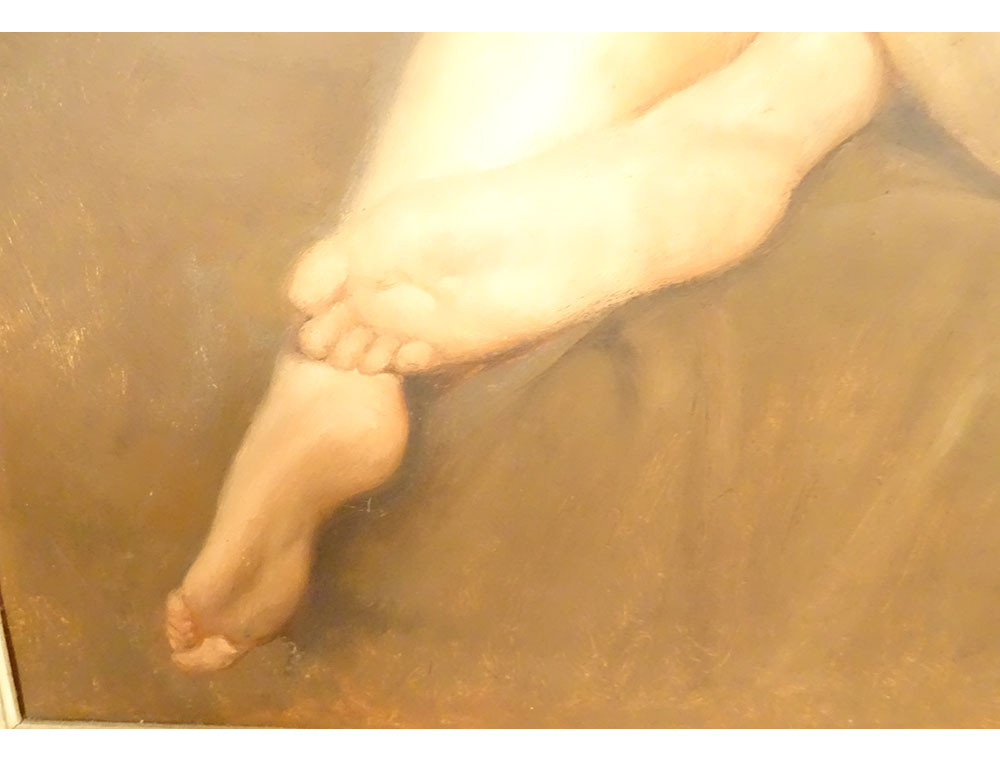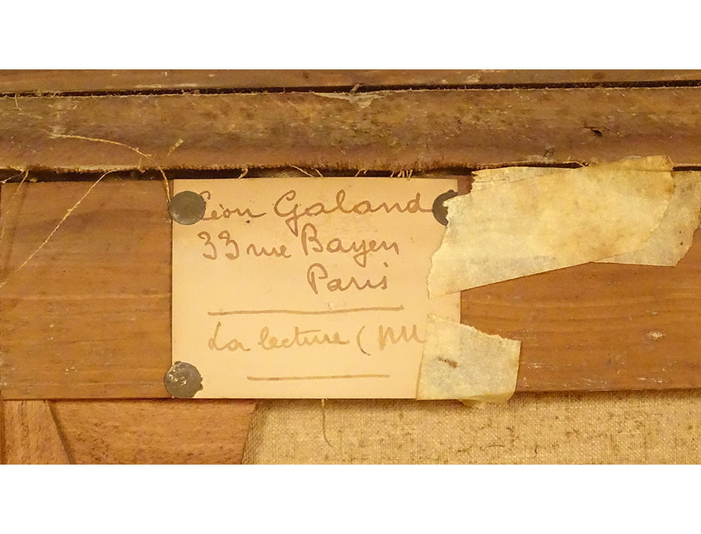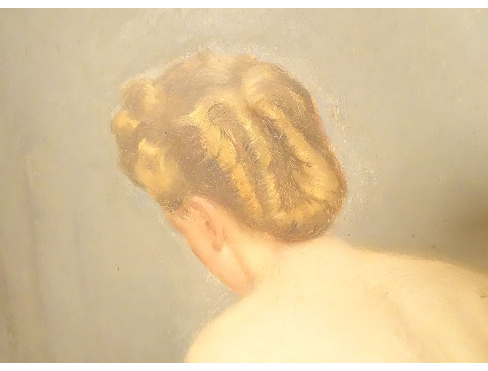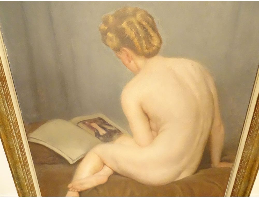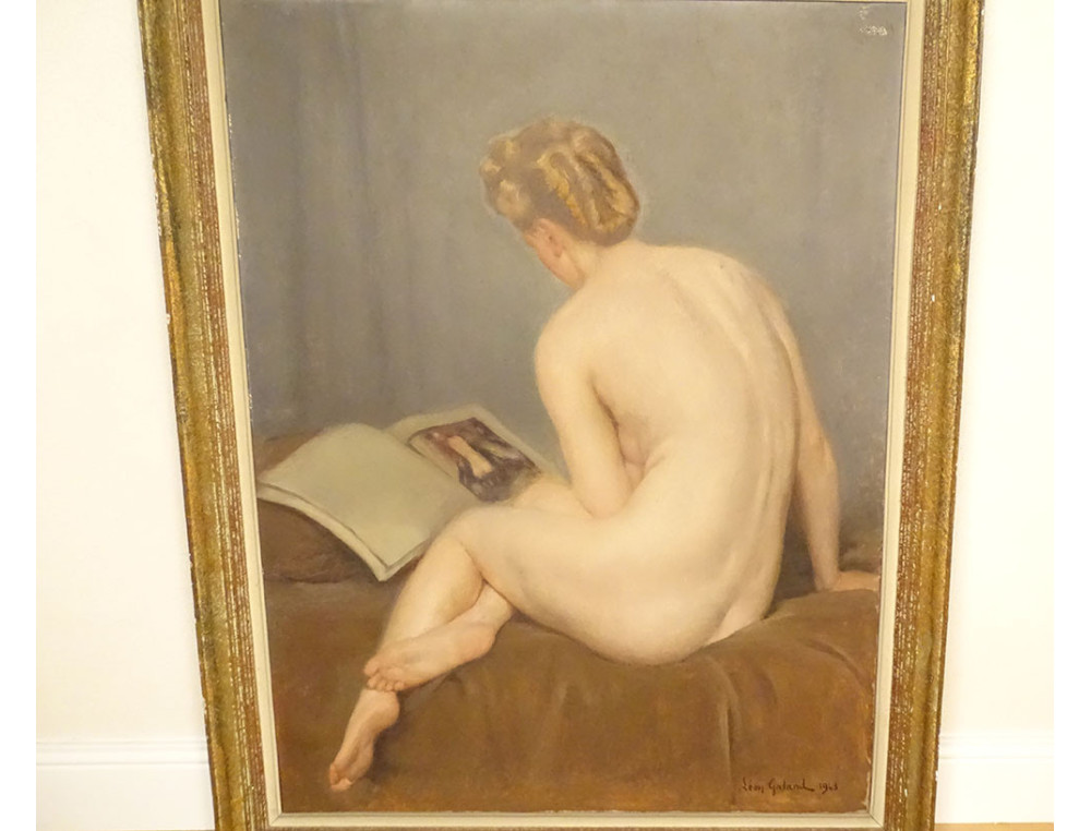 Large oil on canvas signed Léon Galand* representing a nude woman reading, seated and seen from behind, dated 1943, painting exhibited at the Salon of the Society of French Artists on this date, from the 20th century.