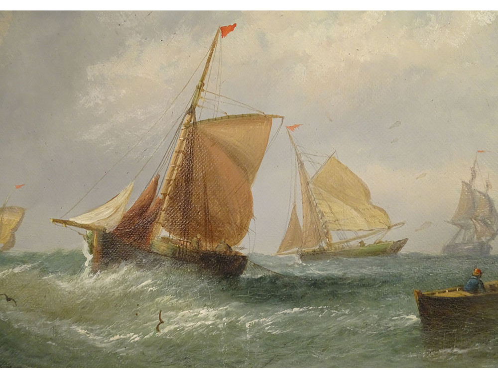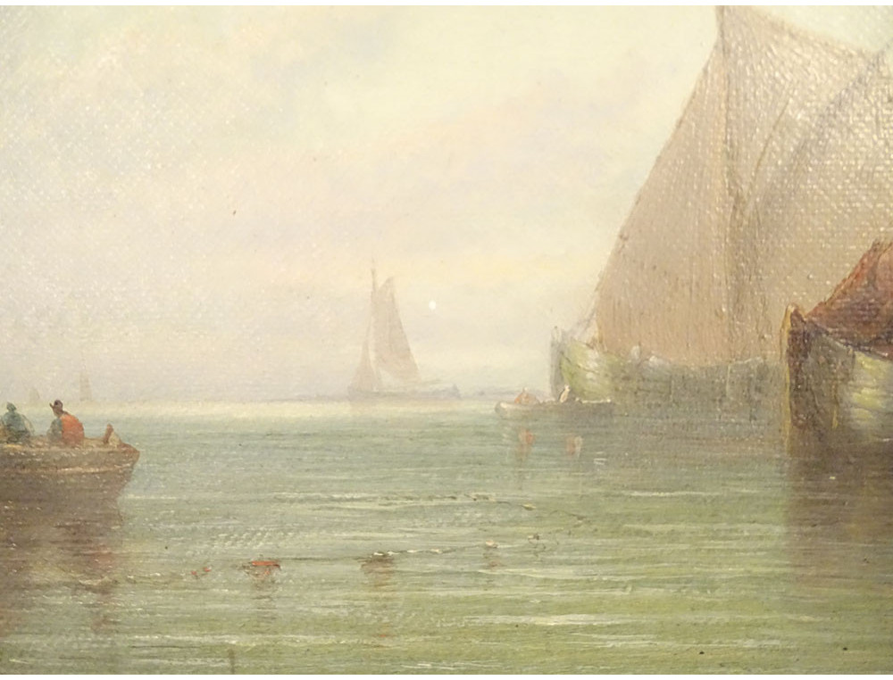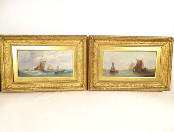 Pair of oil paintings on canvas, marine art by William Calcott Knell, fishing boats, landscape, 19th century
