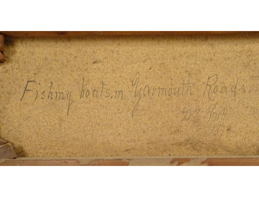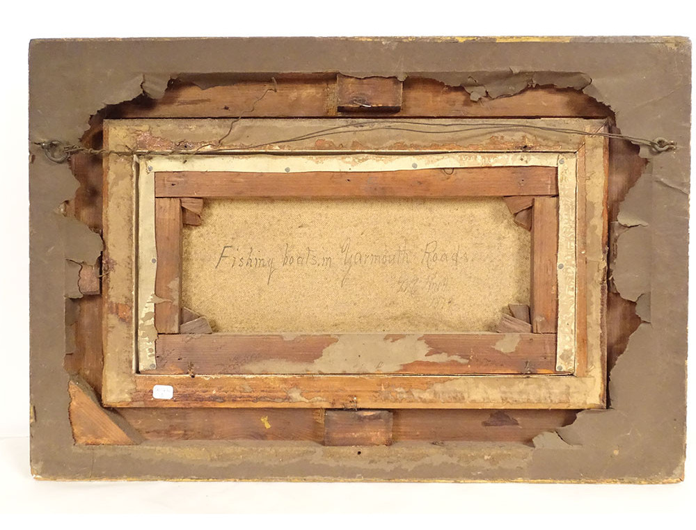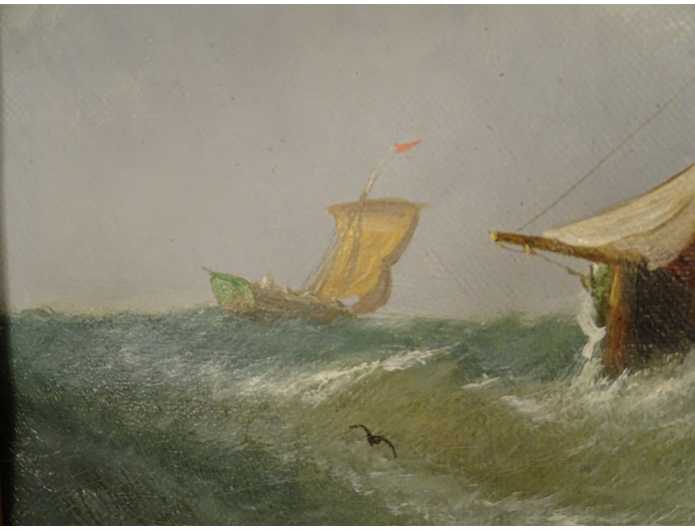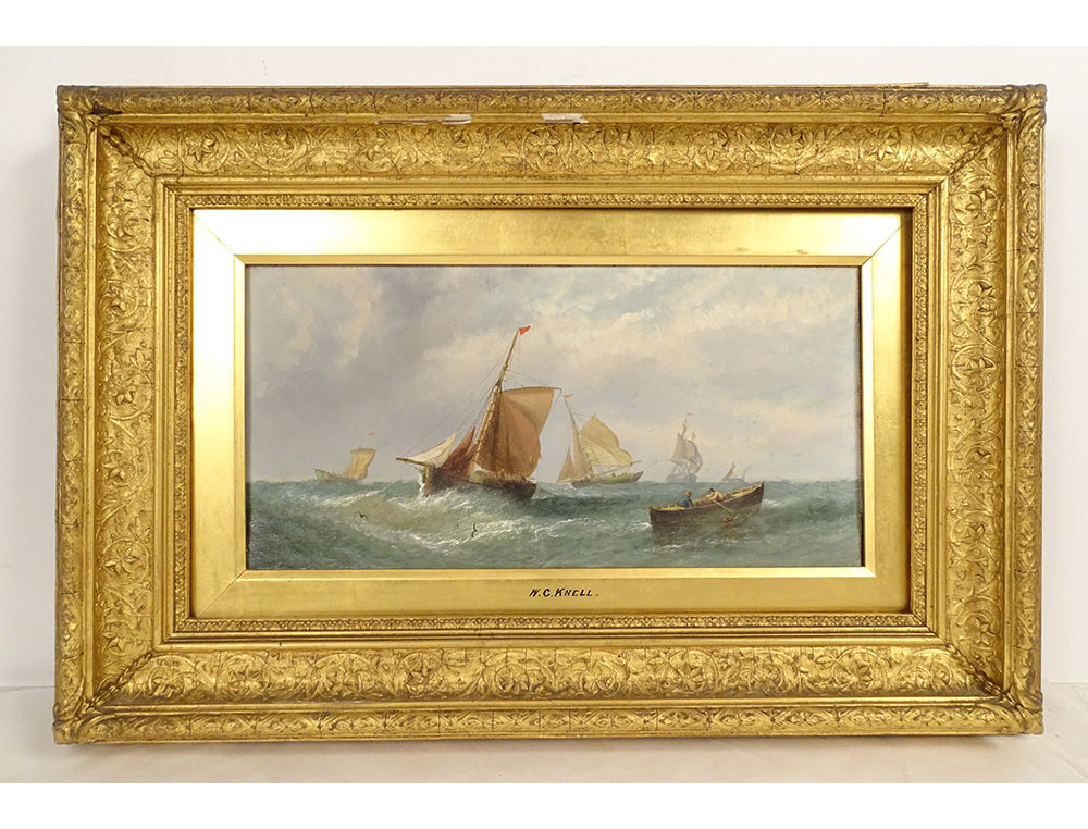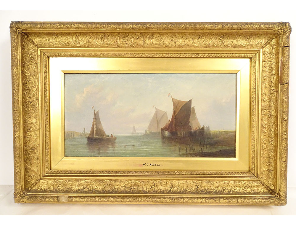 Pair of oil paintings on canvas signed William Calcott Knell* depicting two seascapes with fishing boats in a rough sea and moored on a coastal landscape in England, titled "Morning Dutch Boats Calm River Dorte" and "Fishing Boats Garmouth Roads", dated 1879, in gilt stuccoed wood frames, 19th century period.