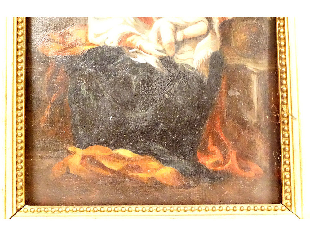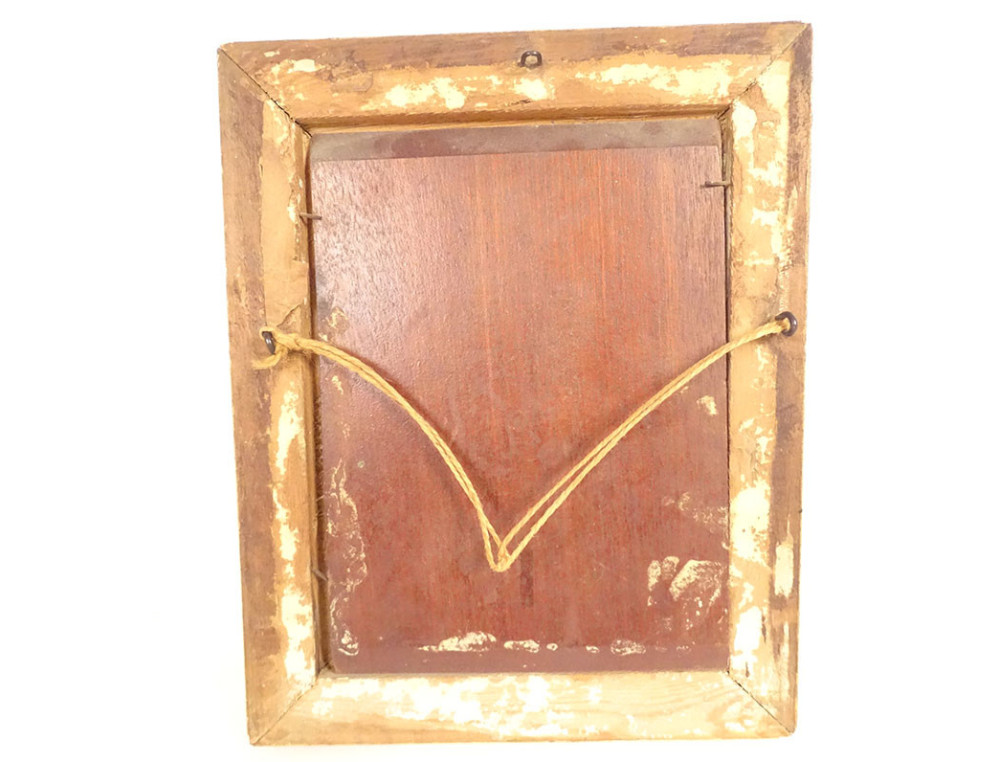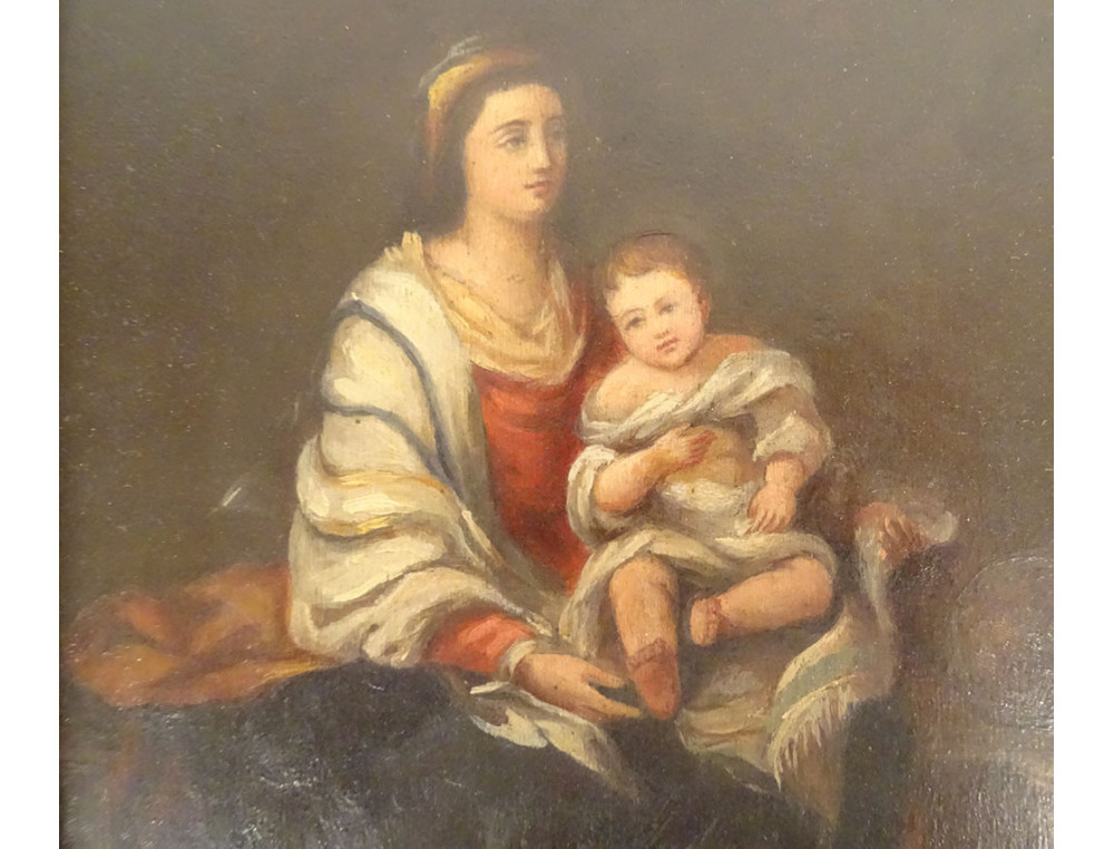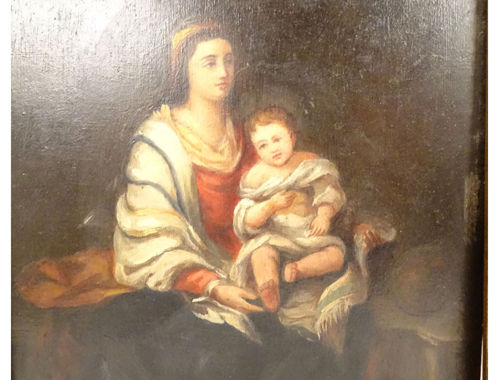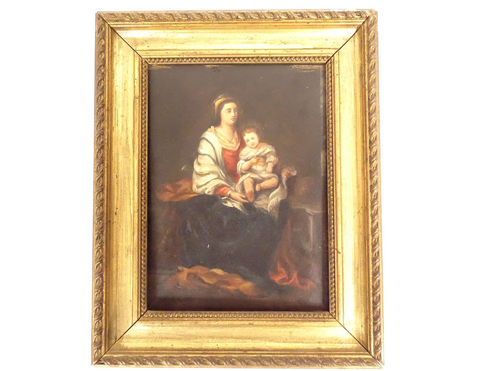 This painting and its frame are in good overall condition. It should be noted that the rosary held by the child in the original painting was omitted from this version.