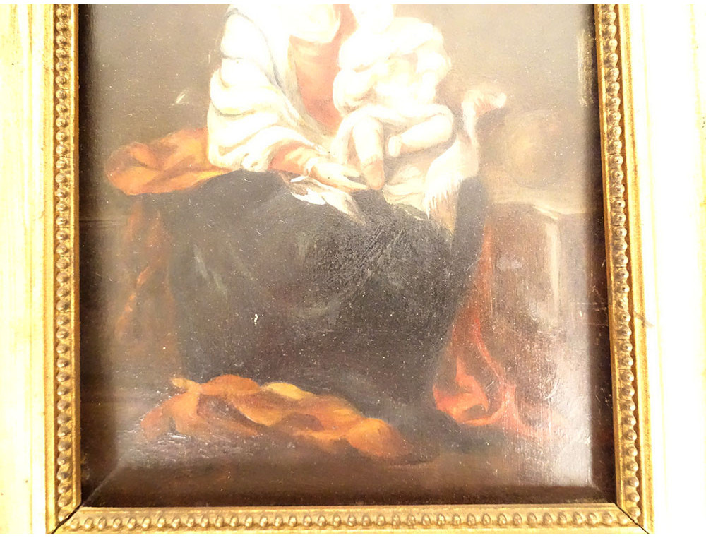 Small oil on panel depicting a Madonna carrying the Infant Jesus on her lap, a copy after the famous painting by Murillo "The Virgin of the Rosary*", in a giltwood frame, from the 19th century.