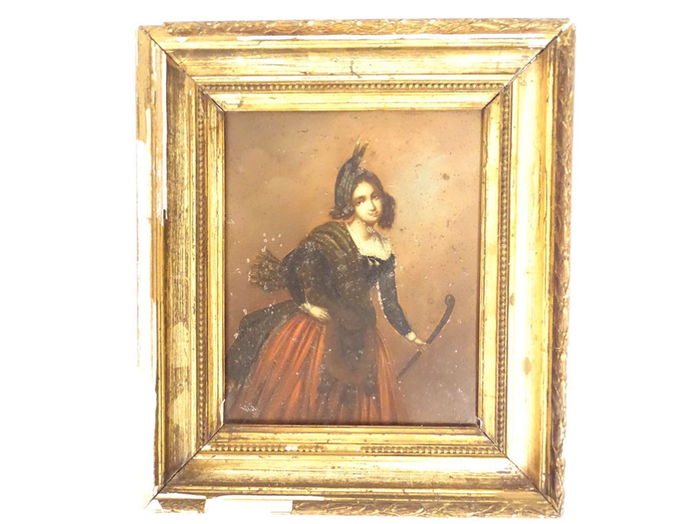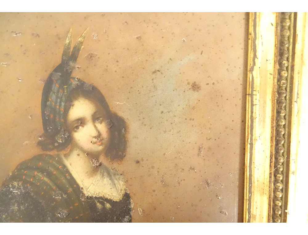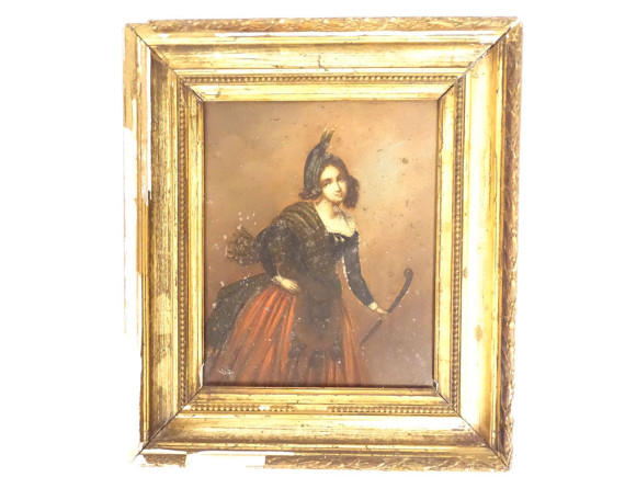Oil on panel (painted on metal or copper) depicting the portrait of an elegant young woman holding a riding crop, and a kind of game bag on the front of her dress, adorned with a fox's head, perhaps a hunting trophy, in a giltwood frame, from the 19th century.