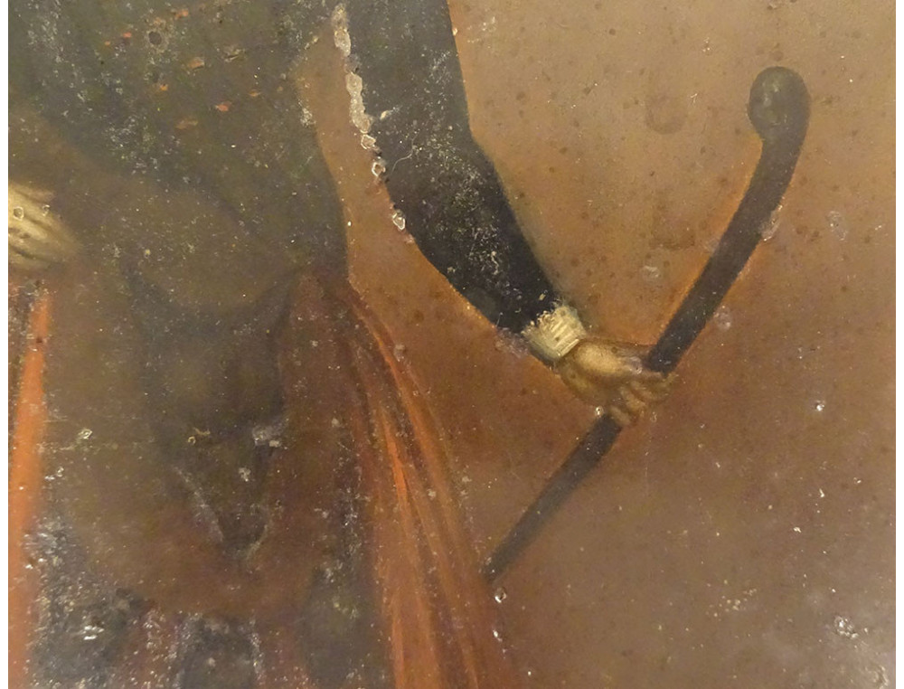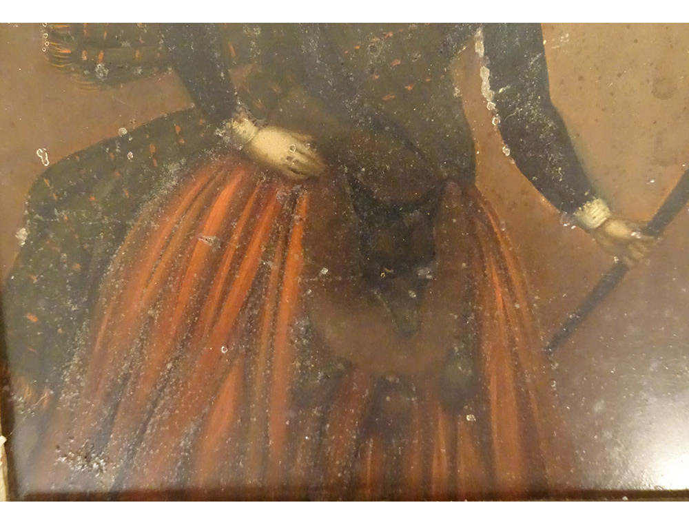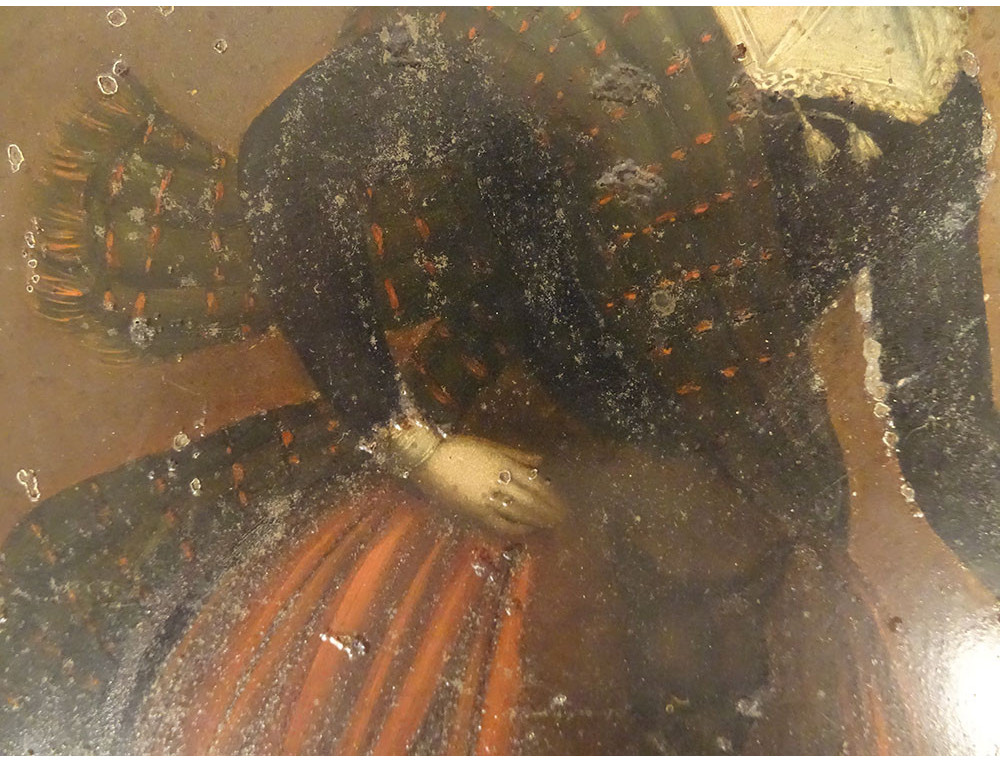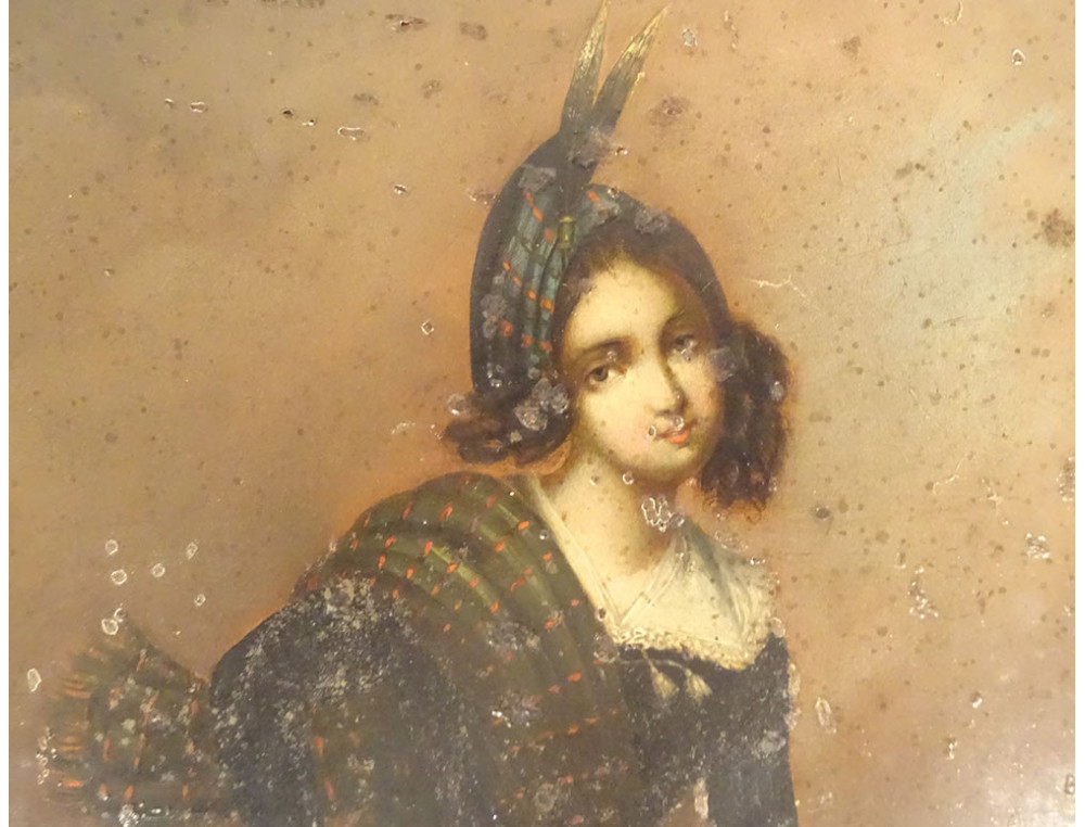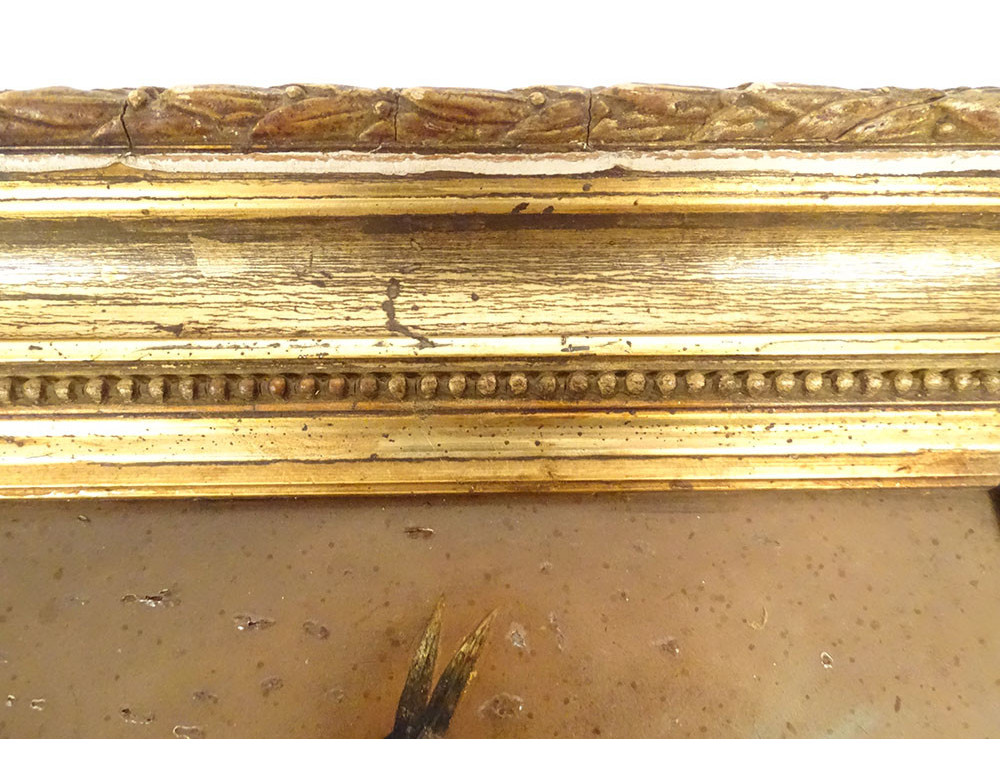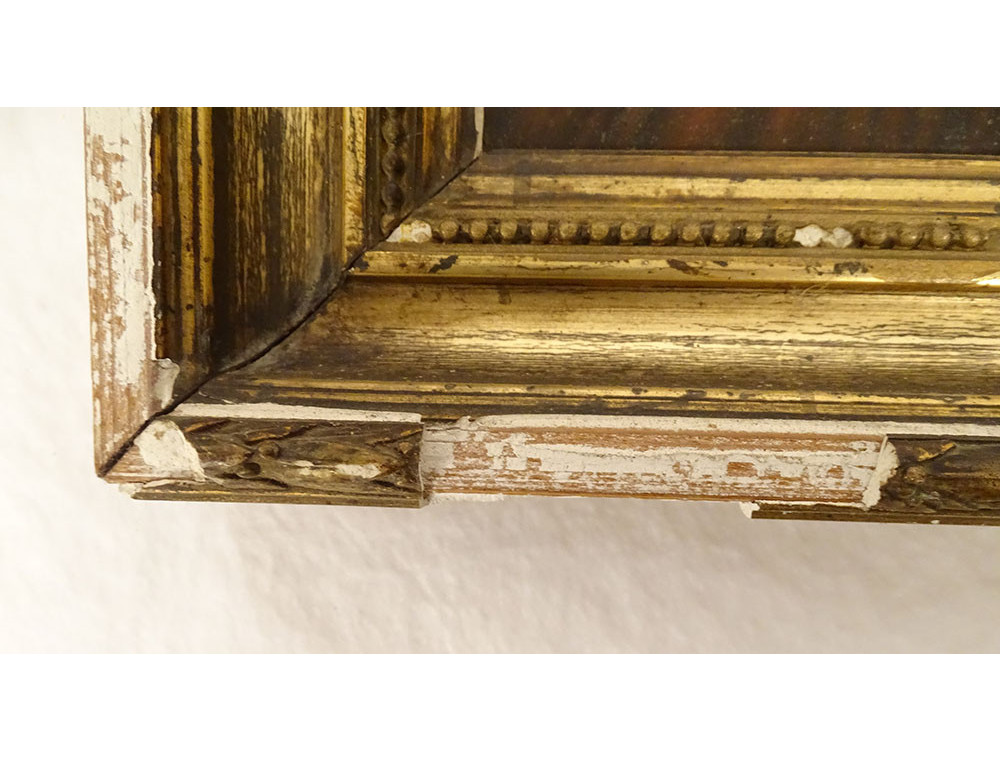 Please note: some defects on the panel due to humidity, some rust spots and stains, worn varnish, damage and missing parts on the frame, see photos.