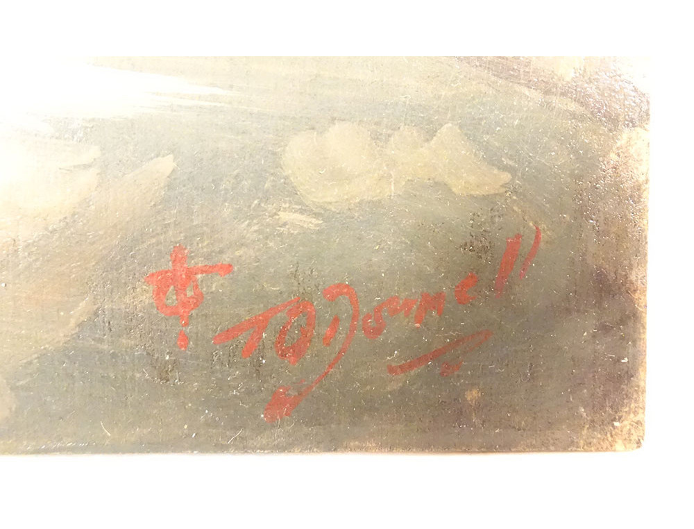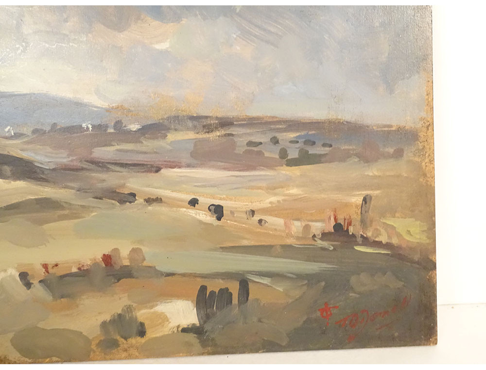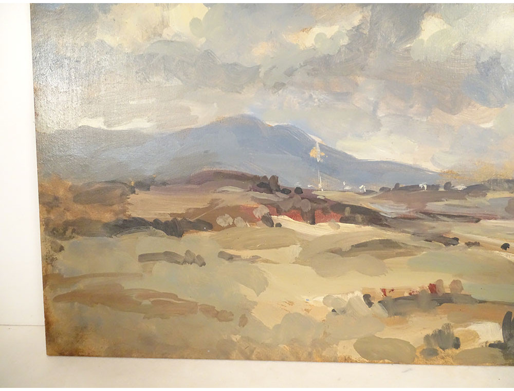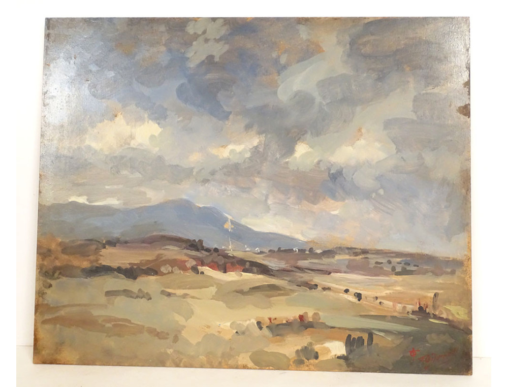 Oil on cardboard depicting a cloudy countryside landscape, with hills in the background, signed lower right (unidentified but marine painter with anchor), early 20th century.