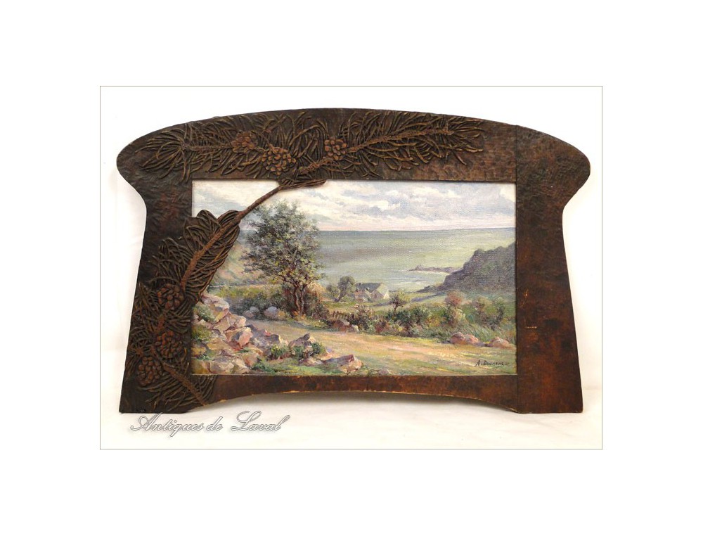 Oil on canvas depicting a landscape with a beachfront cottage nestled in the rocks certainly in Normandy, signed A.Doumenq, vintage early twentieth century.