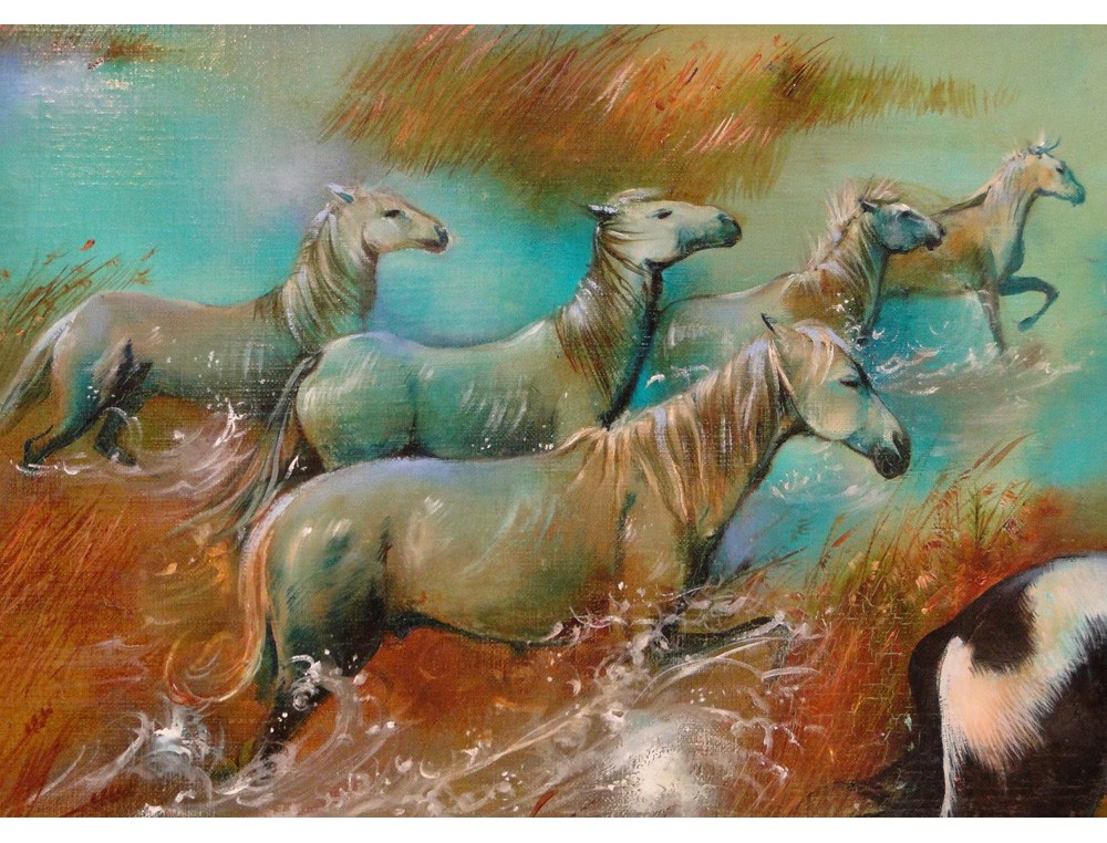Oil on canvas depicting a centaur carrying off a young woman crossing a lake and accompanied by a hawk and five wild horses, entitled "Abduction", Alika Lindbergh * signed, dated 1977, antique twentieth century