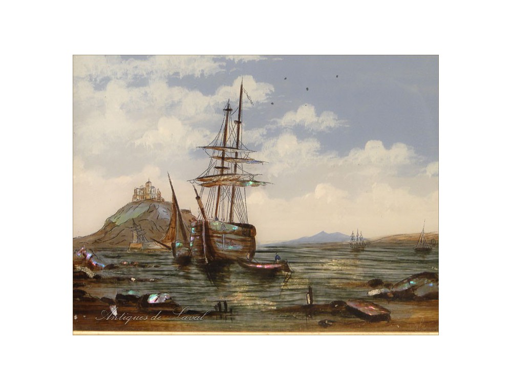 Painting under glass set with mother of pearl representing a navy animated boats, signed Alexander, in a wooden frame stucco golden era of late nineteenth century.