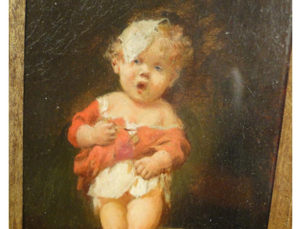 Oil on canvas depicting a fun for a young child to the pot after a pressing need Lanfant signed Metz * of XIXth century.