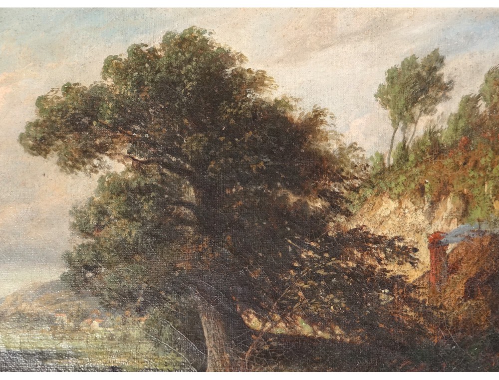 Very nice oil on canvas depicting a landscape, certainly Dauphinois, a shepherd with his sheep to accompany his cottage sheltered under a beautiful tree, a small village in the background, signed Ravanat * Barbizon School of XIXth century .