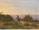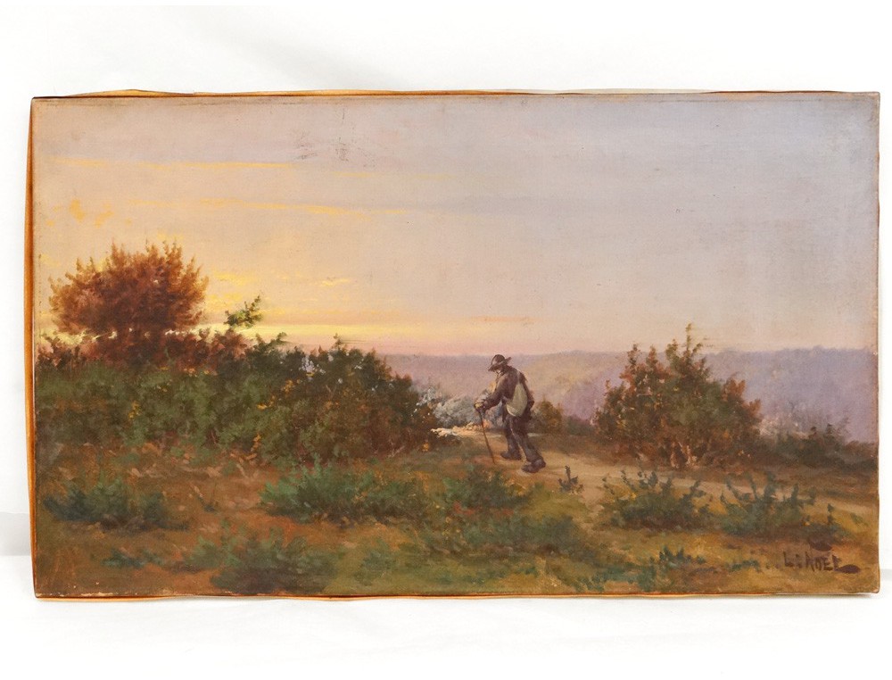 Very nice oil on canvas depicting a character (a vagabond) walking on the moor Breton evening at dusk, with the sun in front of him, signed L.Noël * of XIXth century.