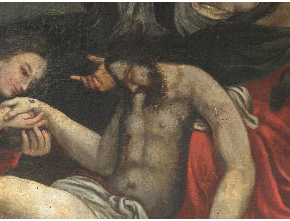 Great oil on canvas depicting the scene of the Deposition of Jesus Christ after his descent from the cross with him around several characters including the Virgin Mary, Mary Magdalene and the apostle John, in the style of the painter's Simon Vouet (1590-1649), antique eighteenth century.