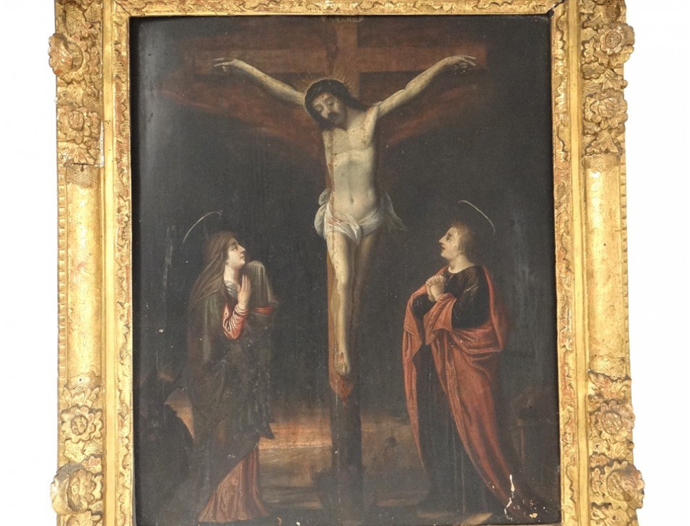 Exceptional and rare oil on panel depicting Christ crucified on the Cross with Mary at his feet, and Mary Magdalene Virgin praying with clasped hands, in a gilded carved wood frame, antique seventeenth century.