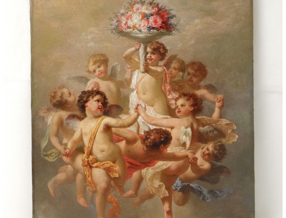 Superb and rare oil on canvas depicting an allegorical view of a round cherubs or putti dancing around a love carrying a glass of colorful flowers in his hands, signed and dated F.Gonin * 1885 XIXth century.
