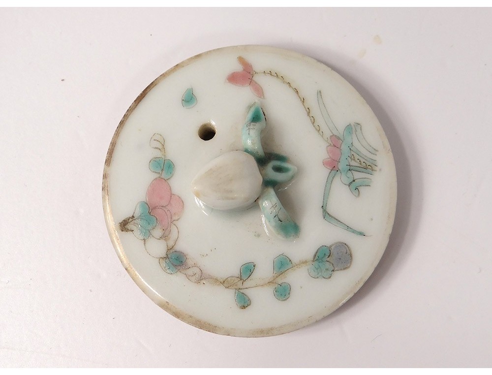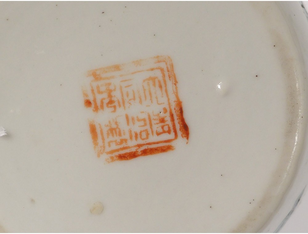 Small teapot in polychrome Chinese porcelain decorated with characters in landscapes: a mandarin with his servants on one side and two characters holding a basket and flowers on the other, Tongzhi signature (1862-1874) underneath, vintage Nineteenth century.