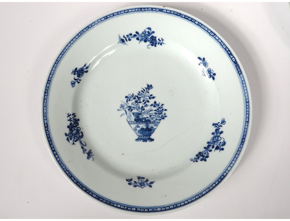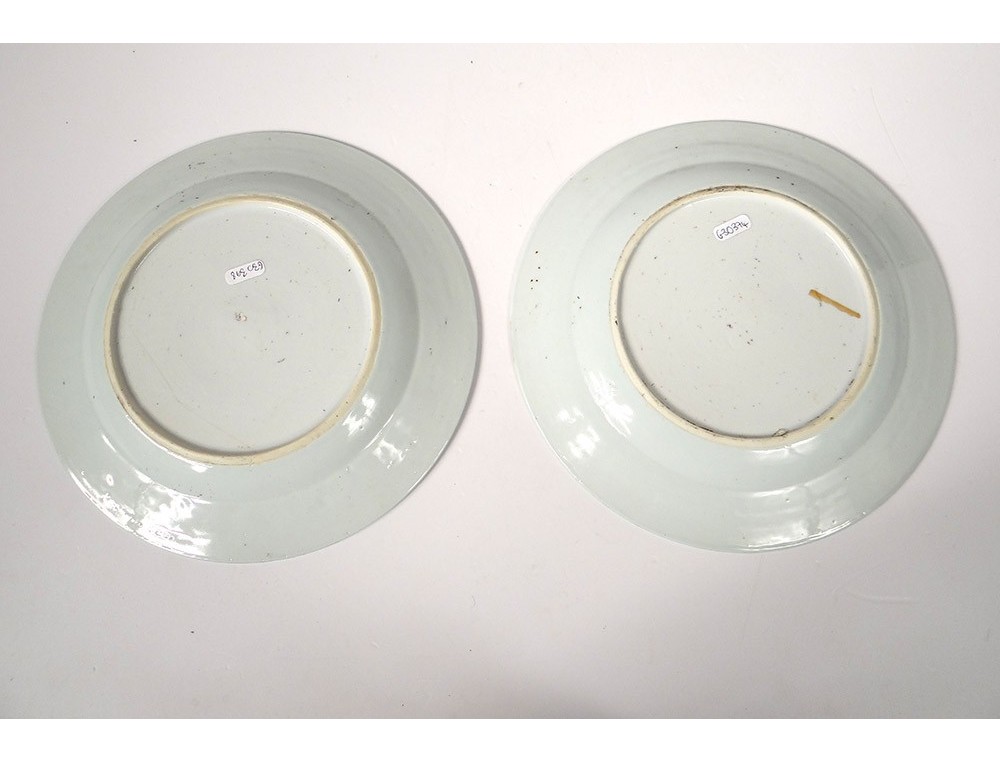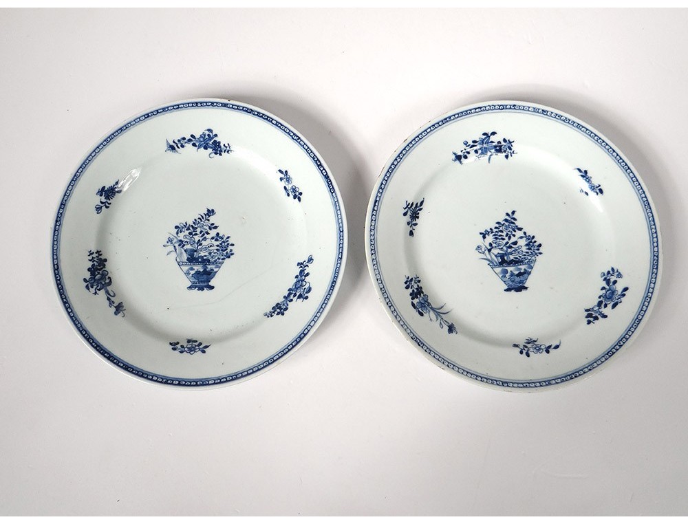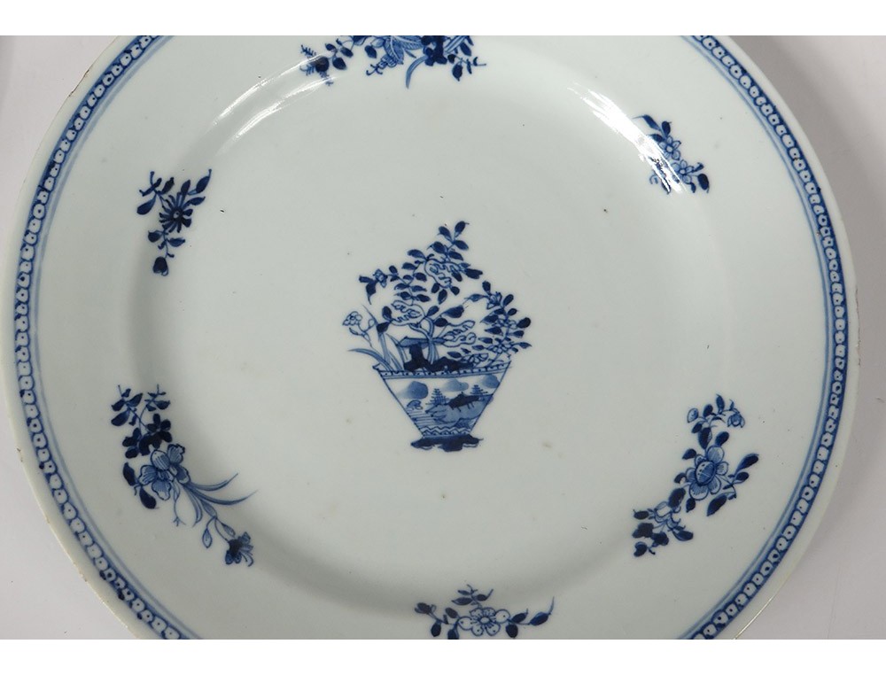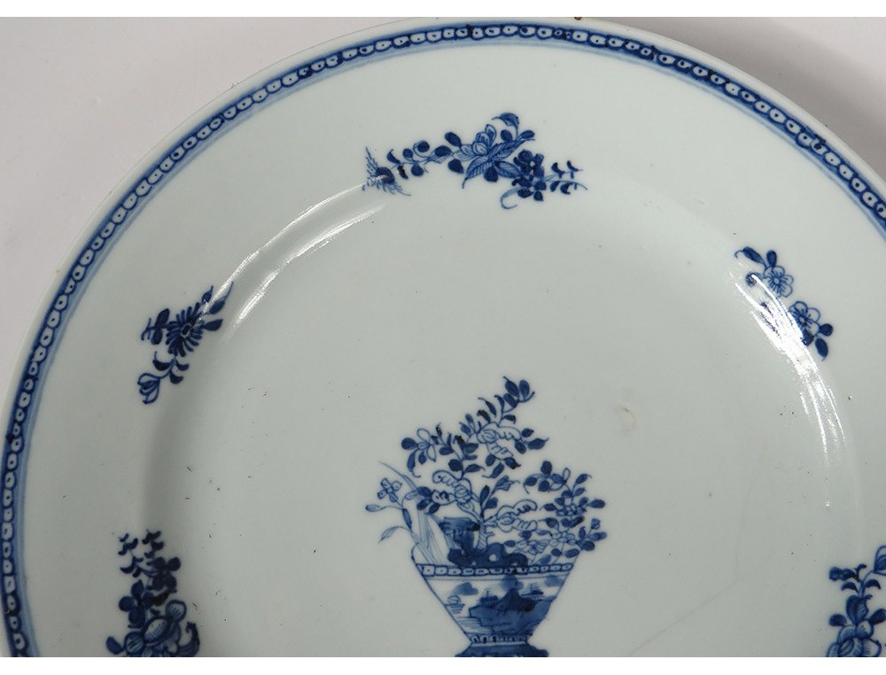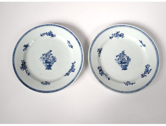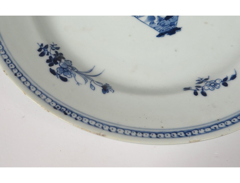 Pair of plates or Chinese porcelain plates of the East India Company, with a white-blue decor of a landscape with a garden in the foreground, in the background a seaside with mountains and a pagoda, as well as small flowers and stylized frieze on the marli, period Kangxi eighteenth century.