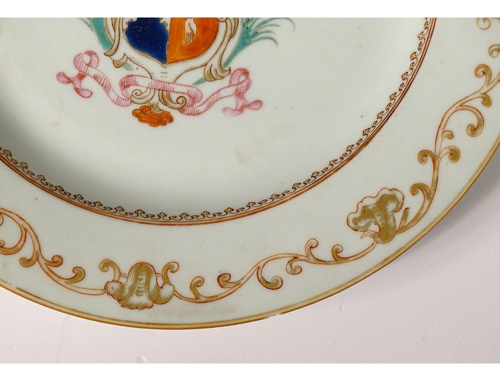 Pair of porcelain dishes from the East India Company, with a central decoration of coats of arms with a double coat of arms (a chevron on the left, three hands facing down on the right) wearing a knight's helmet and a snake , all framed by vegetable arabesques, wing adorned with stylized golden friezes, eighteenth century.