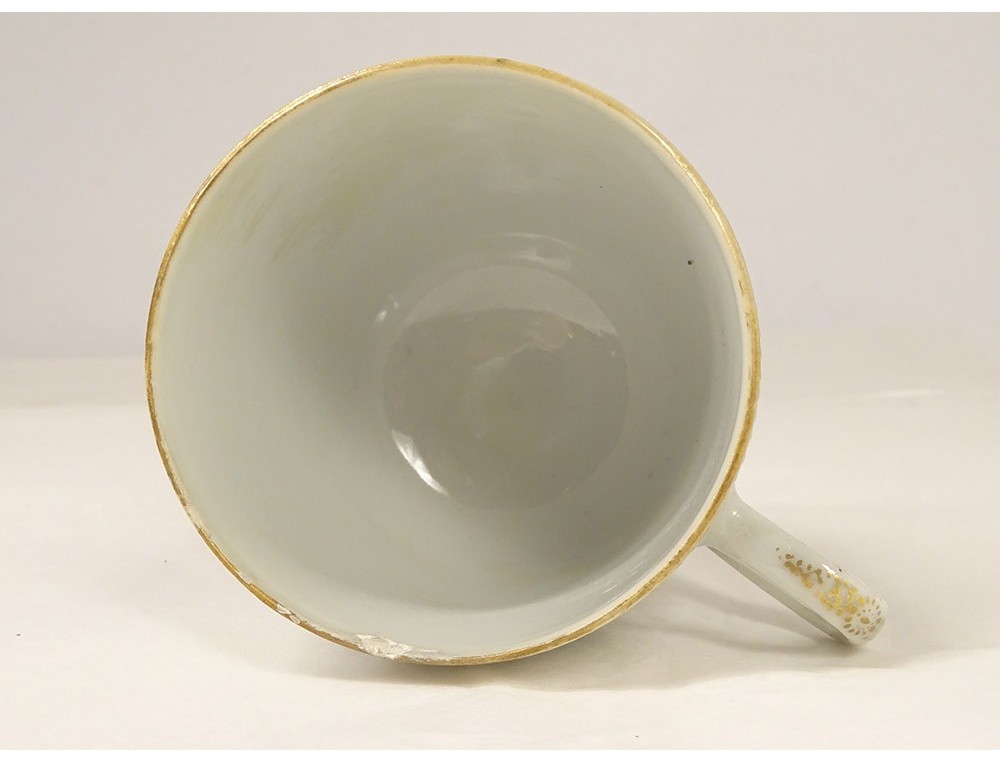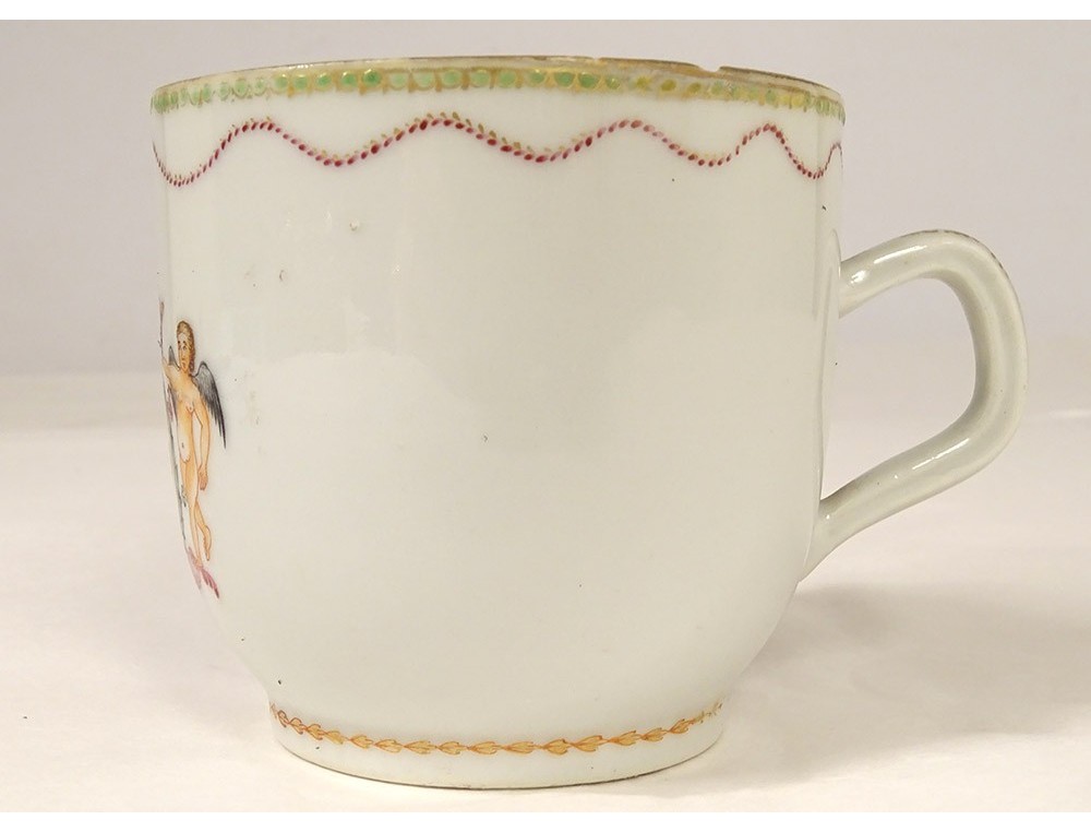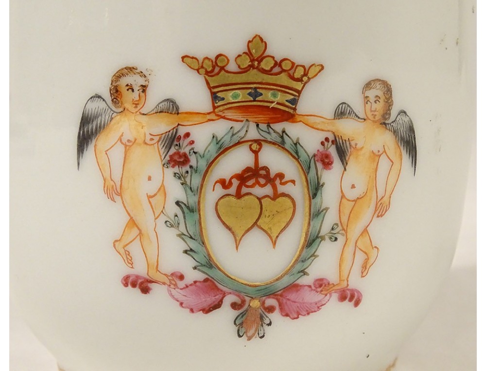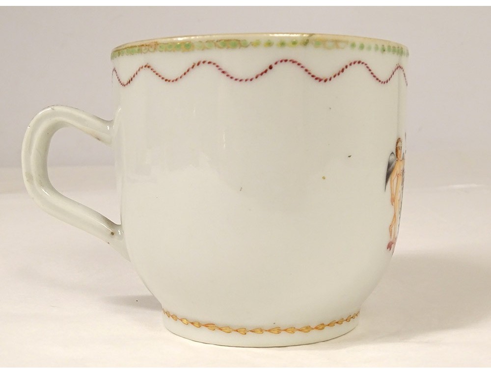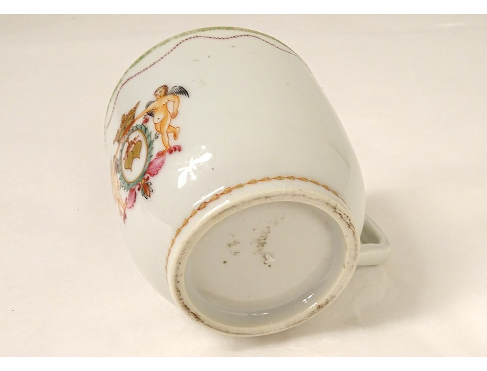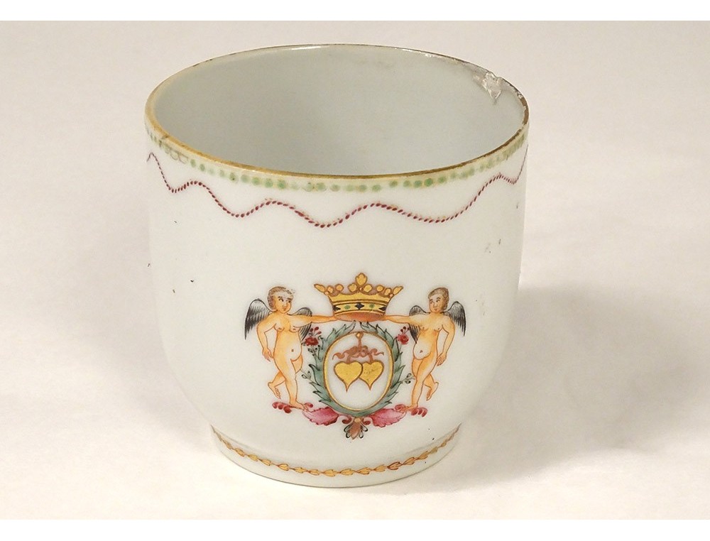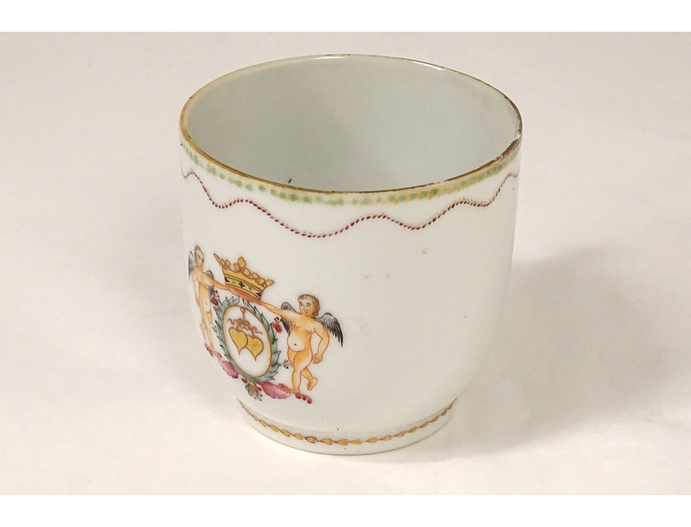 Porcelain cup from the Compagnie des Indes, decorated with a coat of arms made up of a coat of arms with two wrapped hearts, wearing a marquis crown, framed by two angels, from the 18th century.