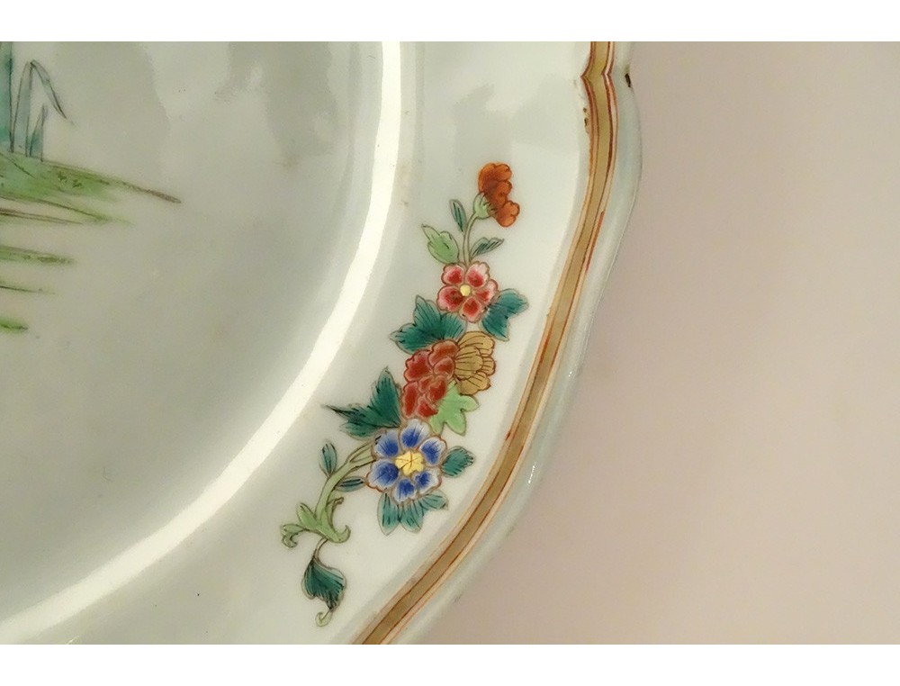 Pair of dishes with scalloped edges, in polychrome Compagnie des Indes porcelain, with a central decoration of birds in a leafy landscape (probably pheasants, ducks and phoenixes), marli decorated with bouquets of colored flowers, enhanced with a gilt fillet in border, from the 18th century.
