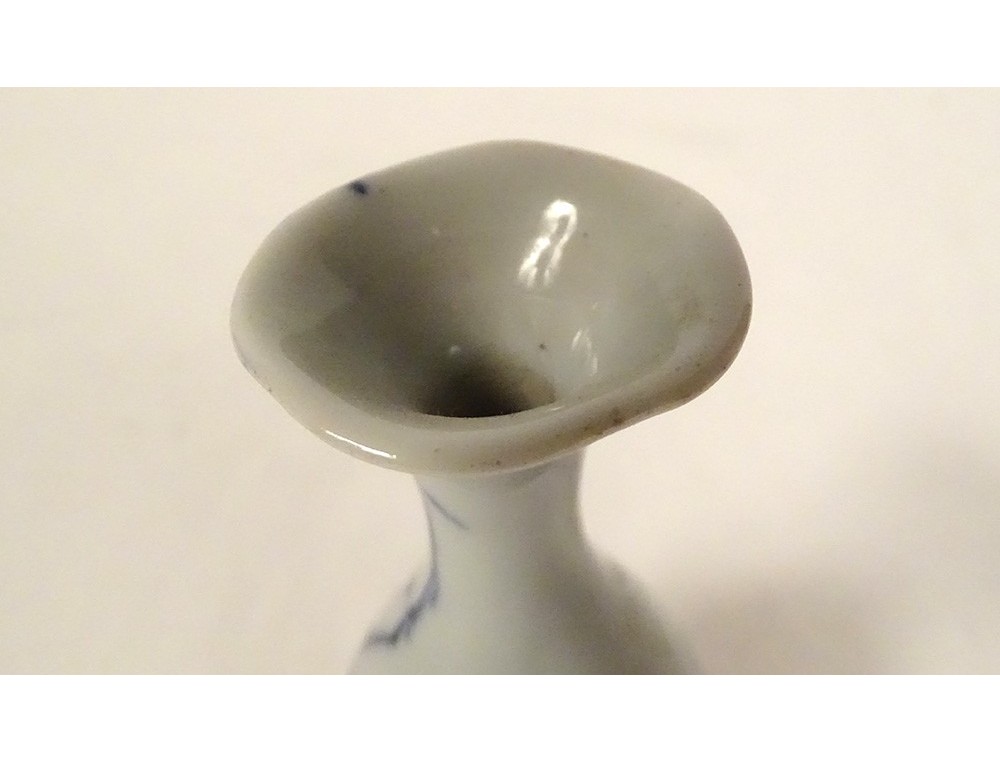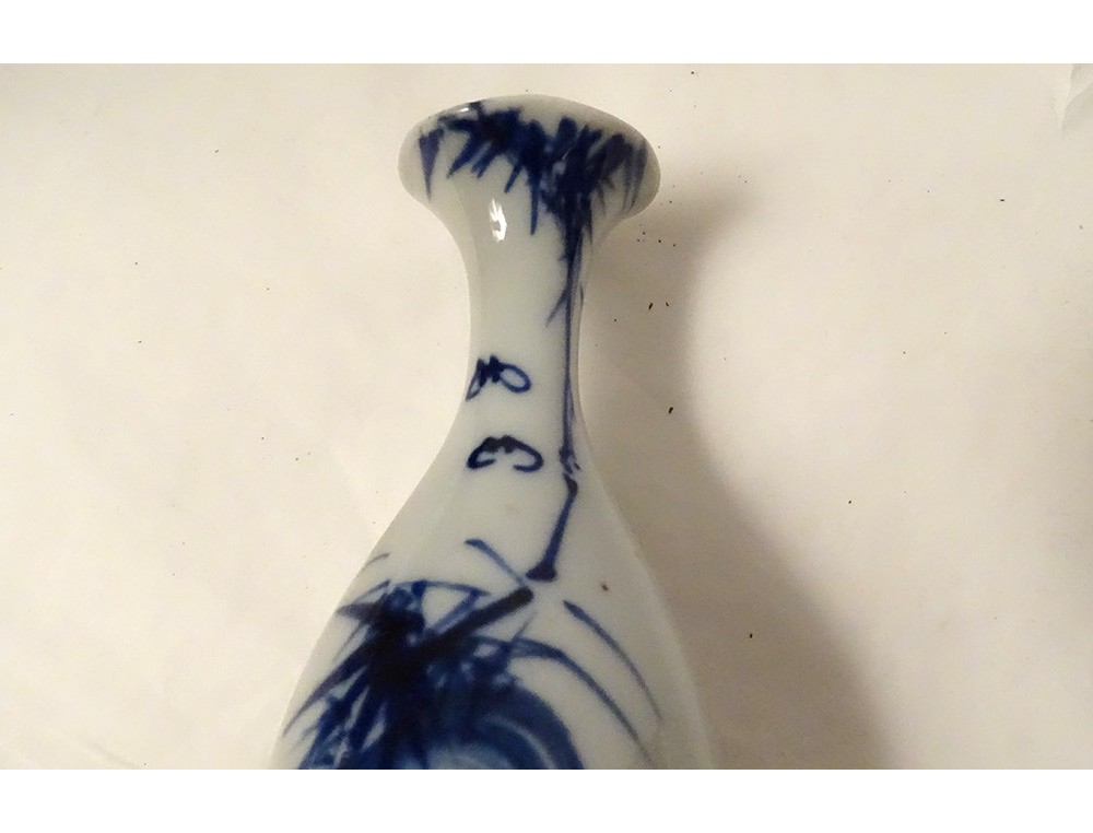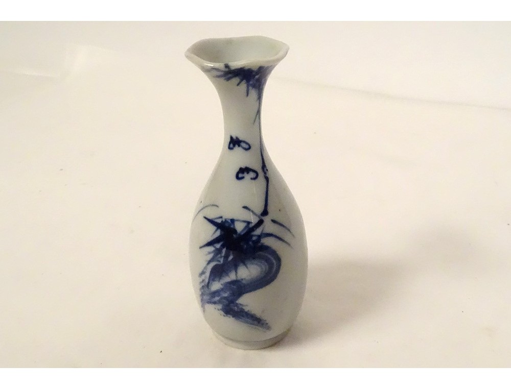Small porcelain soliflore vase with white-blue decoration of bamboo foliage and two bats, from China or Vietnam, vintage 18th century.
