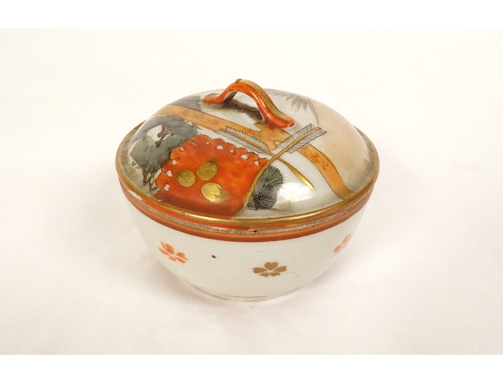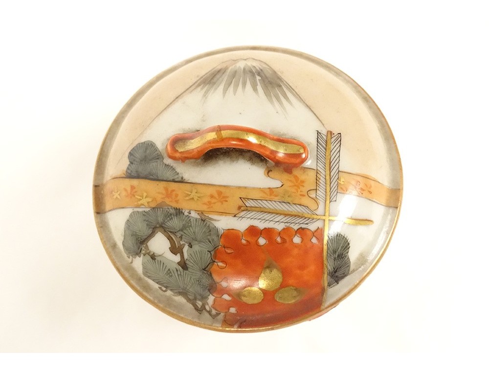 Small Japanese Kutani porcelain box*, decorated on the lid with a landscape with Mount Fuji, as well as small flowers on the body, kutani-yaki signature on the base, from the late 19th-early 20th centuries.