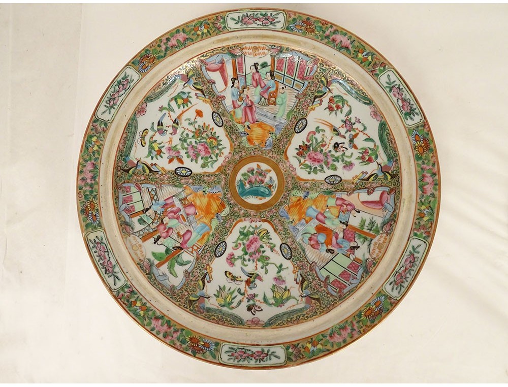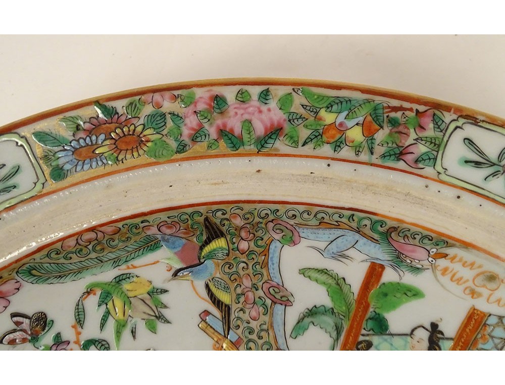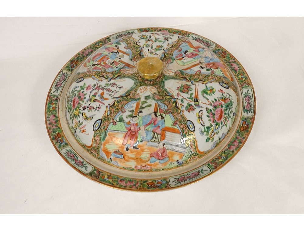 Rare covered dish in Chinese Canton porcelain, richly decorated with figures and women or courtesans, as well as multiple multi-colored birds, butterflies and colorful flowers in reserves surrounded by a lively stylized plant motif enhanced with gilding, from the 19th century.