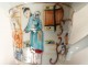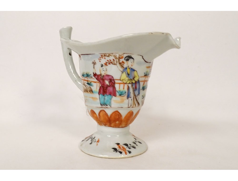 Small helmet-shaped jug or ewer called Hanap in porcelain from the East India Company, with "mandarin palette" decoration of characters accompanied by a dog in a flower garden landscape, from the 18th century.