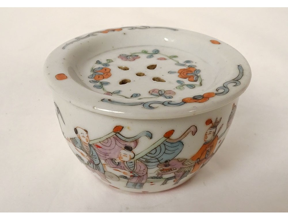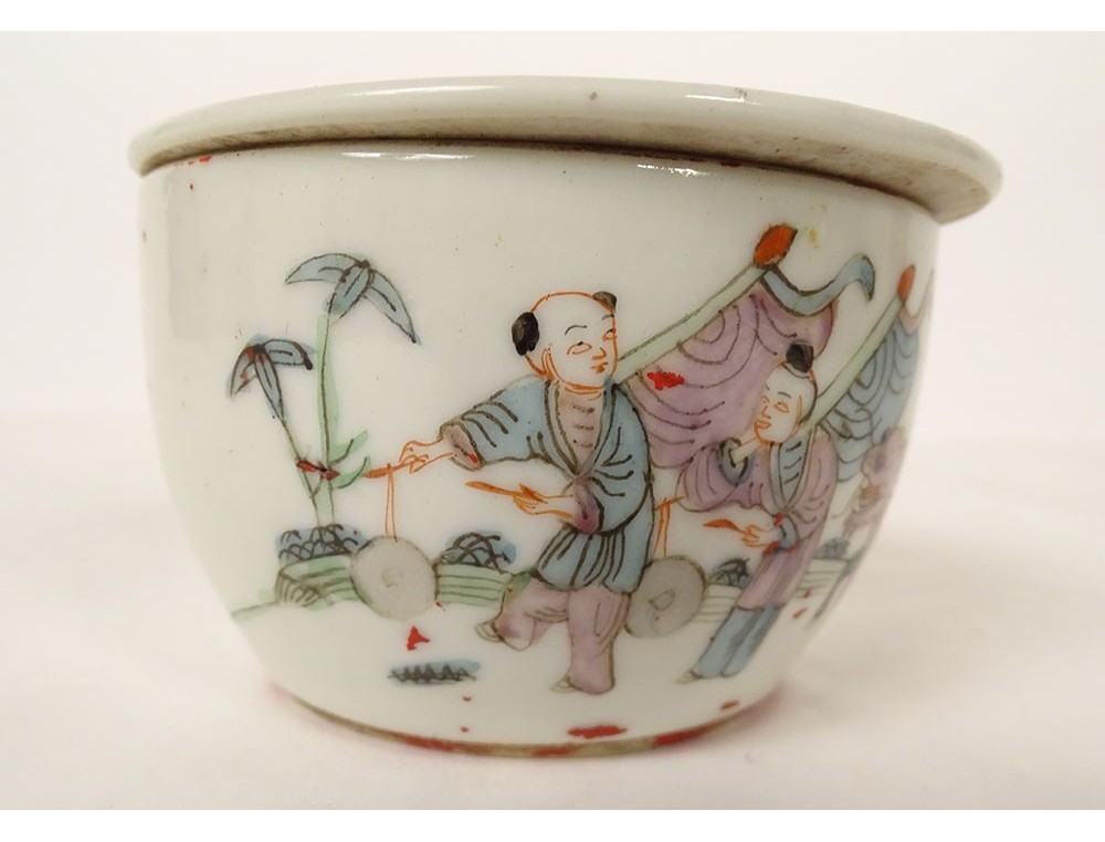 Round cricket box in polychrome Chinese porcelain decorated with various figures: servants in procession surrounding a man mounted on a dragon or fantastic animal, probably a representation of Lao-Tseu and his disciples, signed below (Tongzhi period 1862-1874?), from the 19th century.