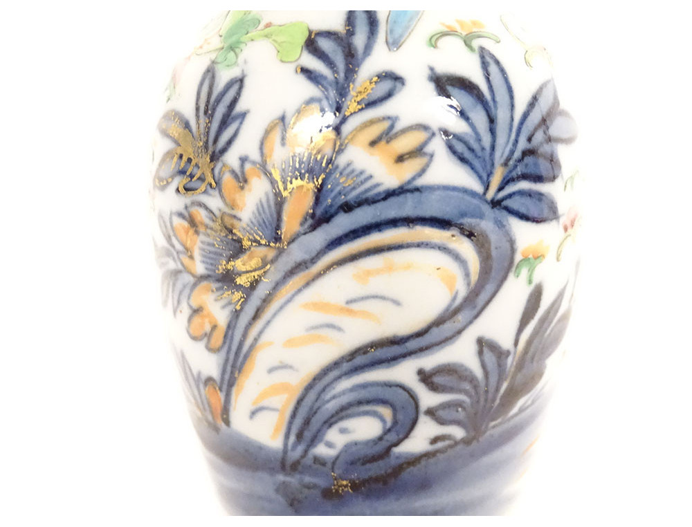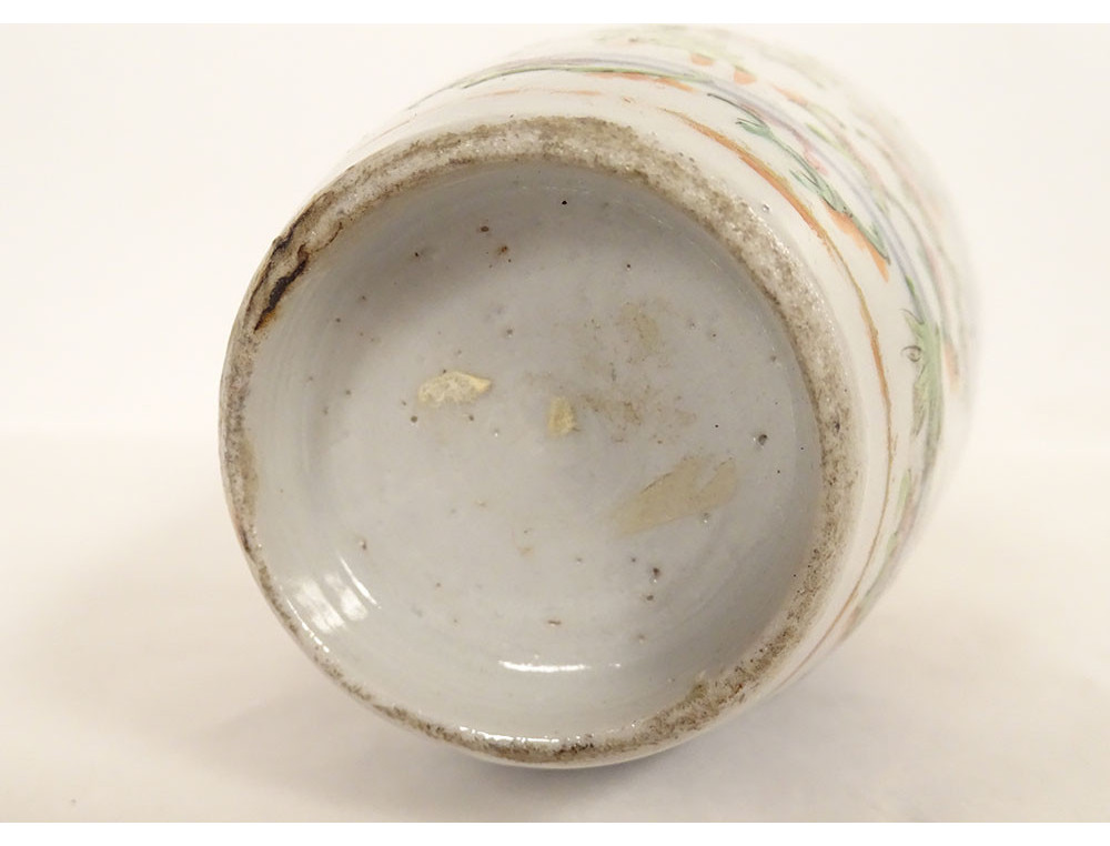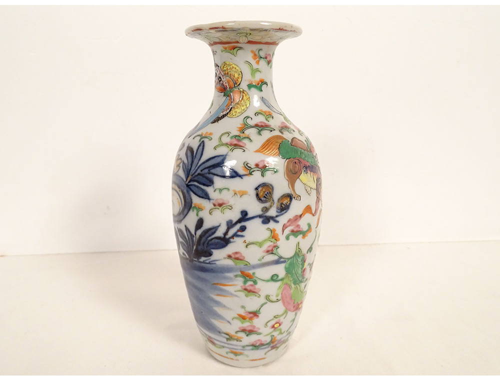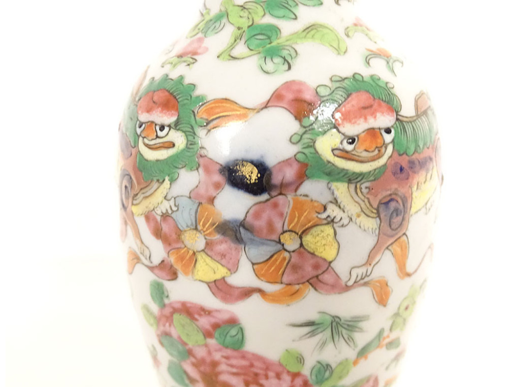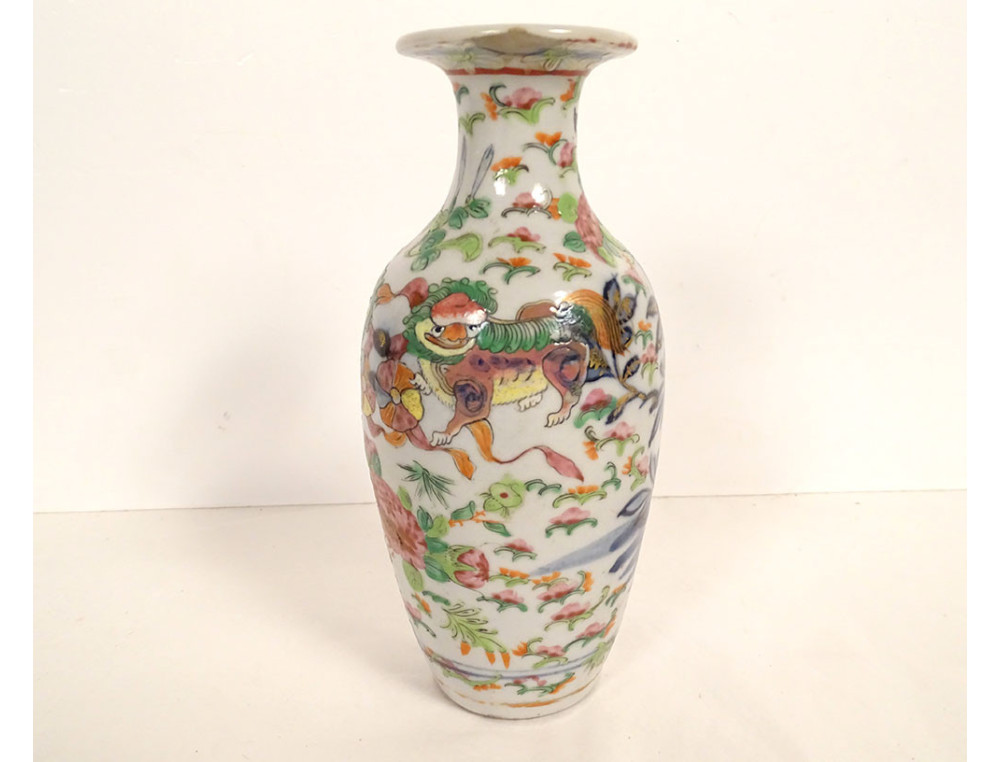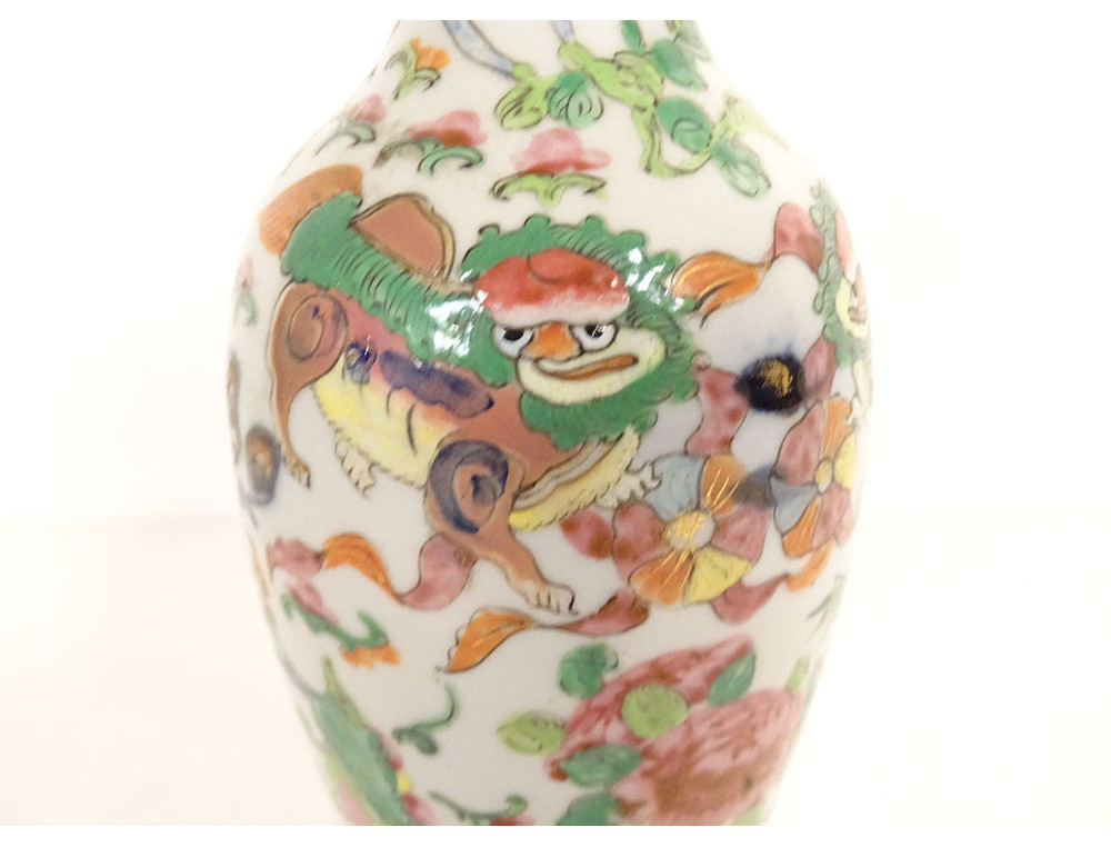 Small baluster-shaped vase in polychrome Chinese porcelain, decorated with two dragons or Foo dogs facing each other, surrounded by pink peonies, colorful foliage and other blue-gold tones, as well as butterflies, from the early 19th century.