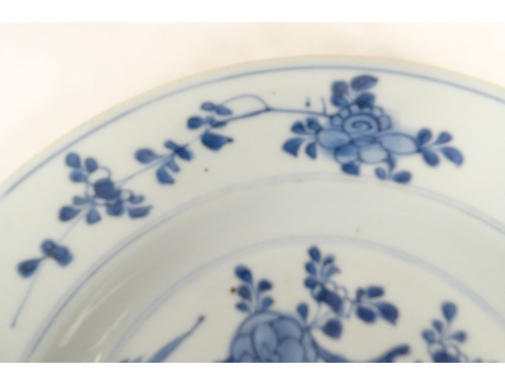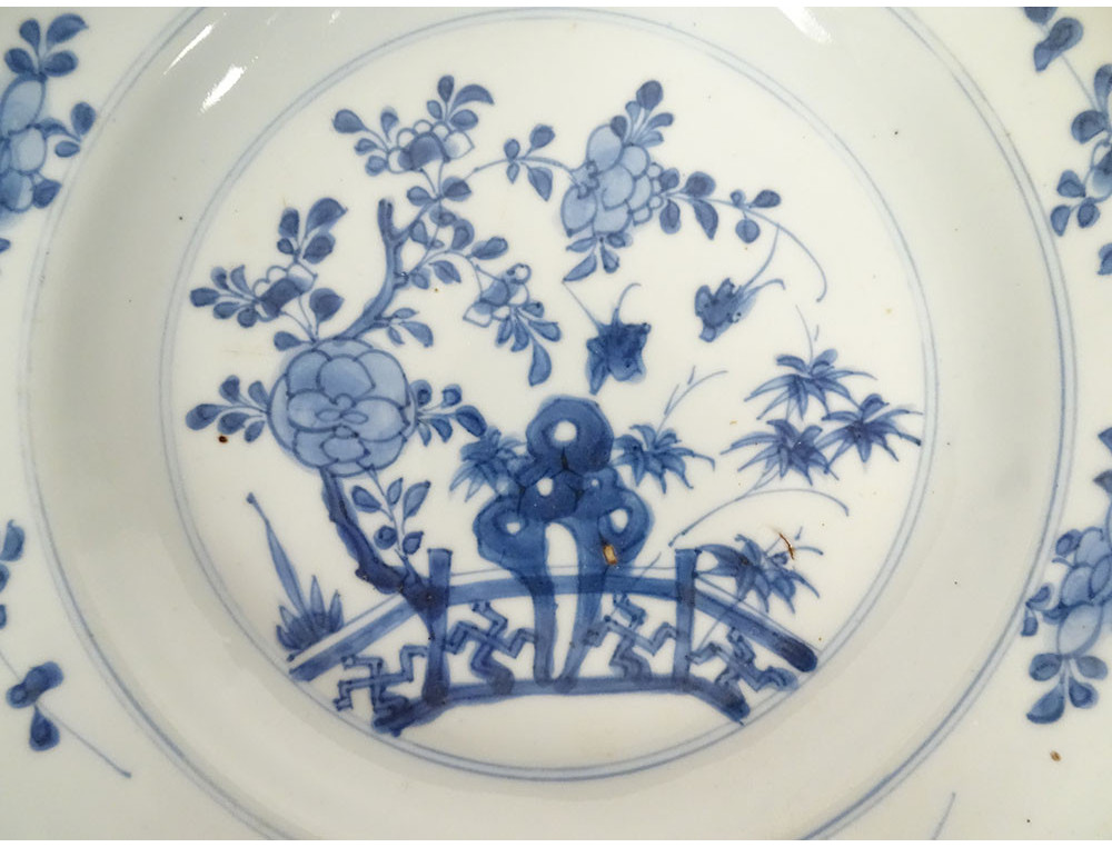 Set of 2 plates or dishes in Chinese porcelain from the East India Company with white-blue decoration of small furniture in a pagoda interior (pedestal, vase and bench), rim decorated with fruit and foliage (bamboo) from the Kangxi period 18th century.
