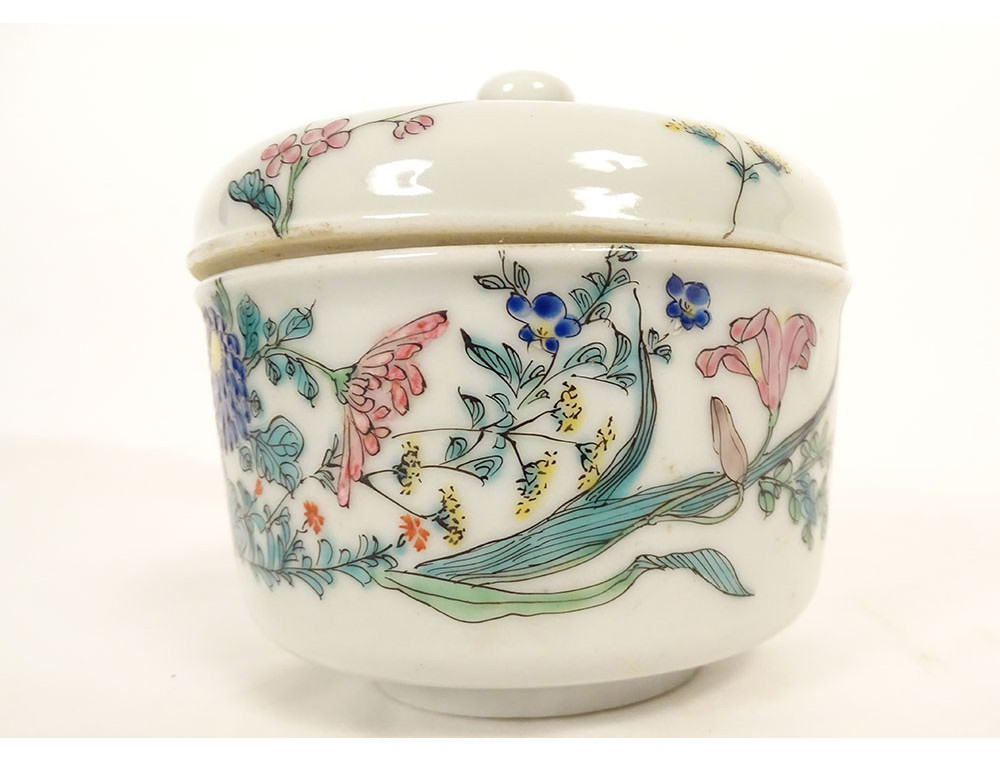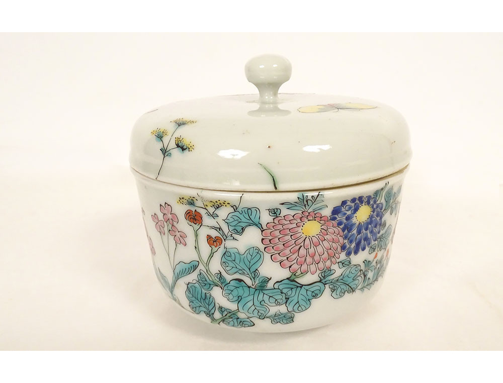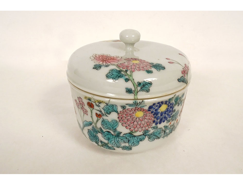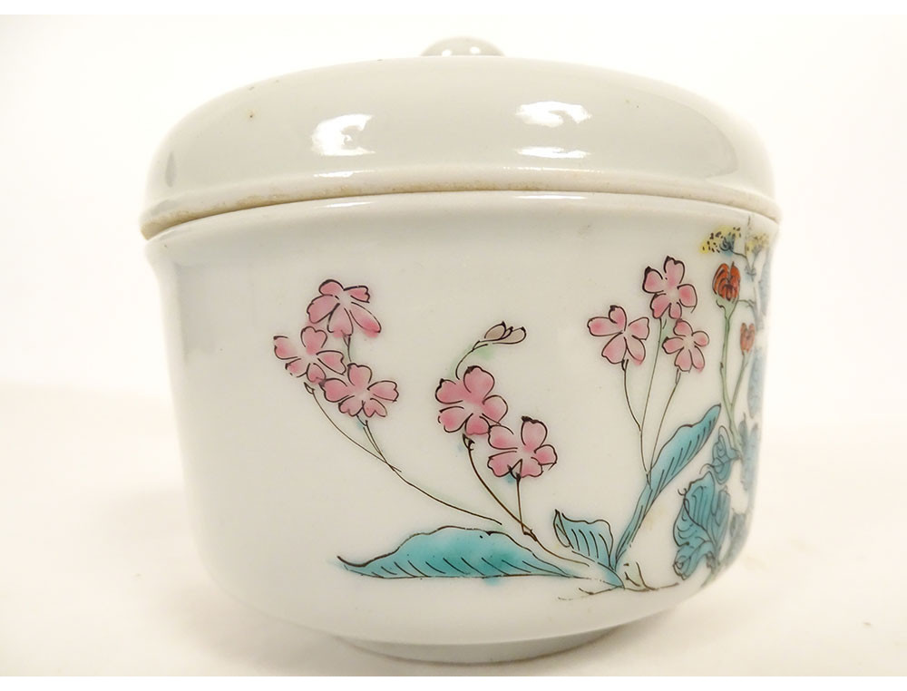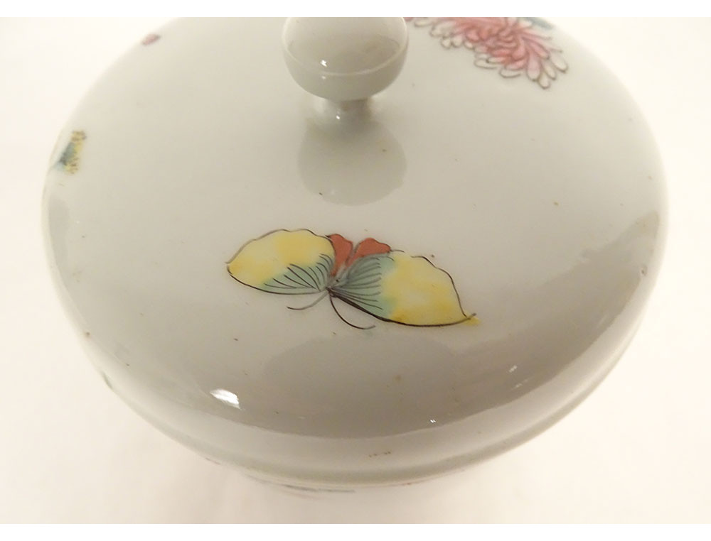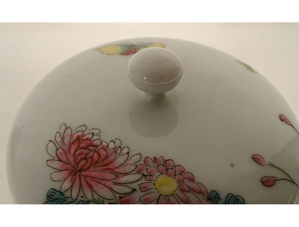 Small box or covered pot that can be used as a sugar bowl or candy dish, in polychrome Chinese porcelain decorated with colorful flowers (including peonies and bindweed), with a butterfly on the lid, signed underneath, dating from the early 20th century.